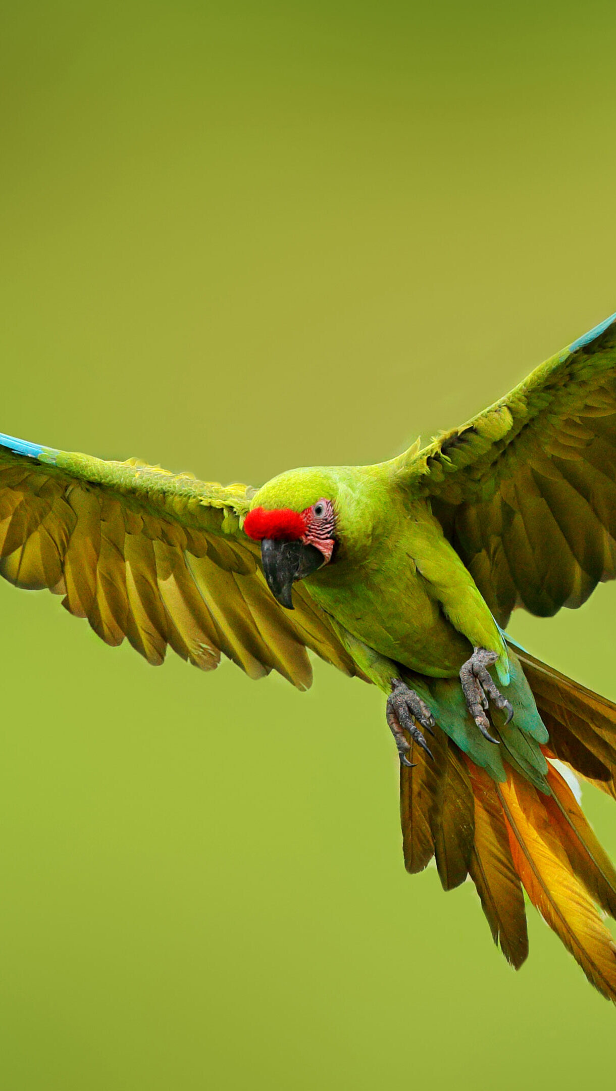 A dynamic 4K wallpaper showcasing a magnificent Great Green Macaw in full flight over Mexico against a soft, blurred green background. Its vibrant emerald and gold plumage, accentuated by bright red and blue details, is captured mid-air with powerful wings fully extended, creating a vivid and energetic impression.