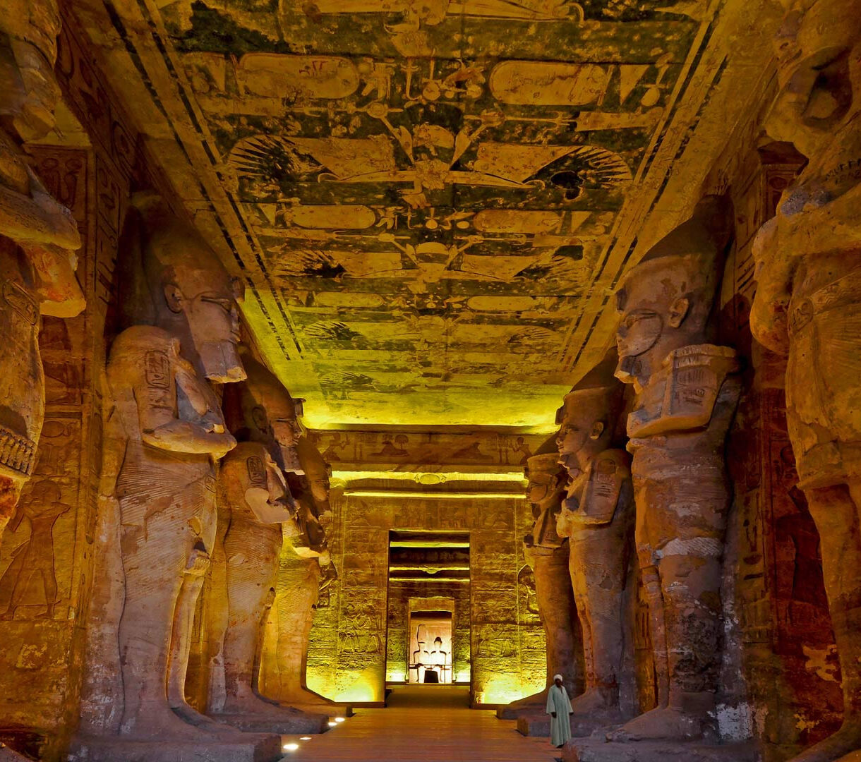 A captivating 4K wallpaper presenting the majestic interior hall of the Great Temple of Ramesses II, where colossal pharaonic statues line both sides, leading the eye into the depths of the ancient structure. The warm, golden illumination bathes the towering figures and ancient hieroglyph-covered ceiling, evoking a powerful sense of awe and timeless grandeur.