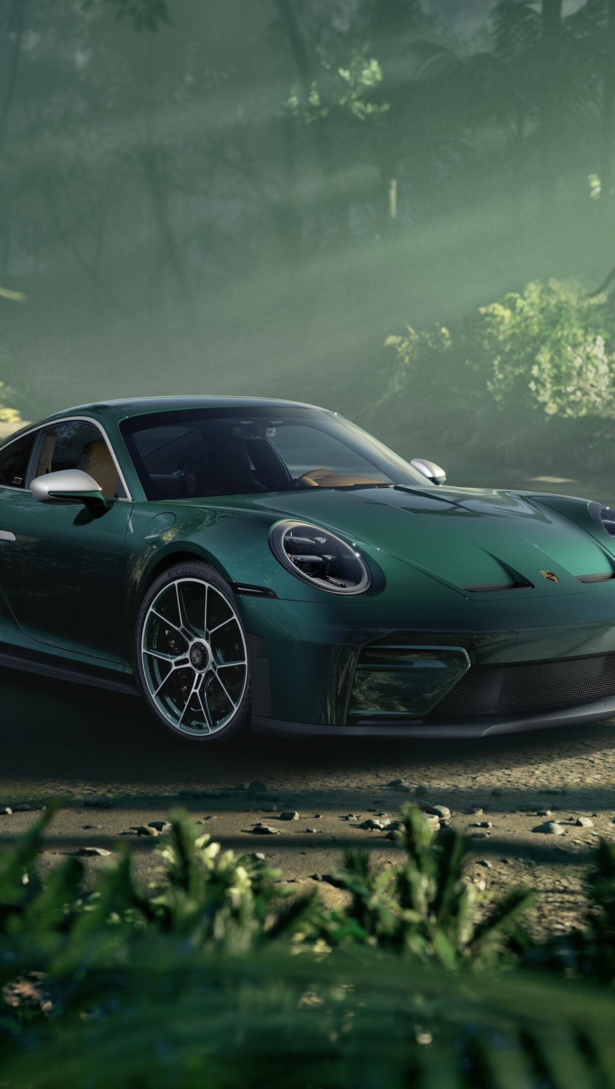 An atmospheric 4K wallpaper presents a sleek green Porsche 911 sports car parked on a dirt road within a dense, misty jungle. Sunlight beams pierce through the thick canopy and ethereal mist, illuminating the car's vibrant green finish and creating a dramatic, adventurous mood amidst the abundant tropical foliage.