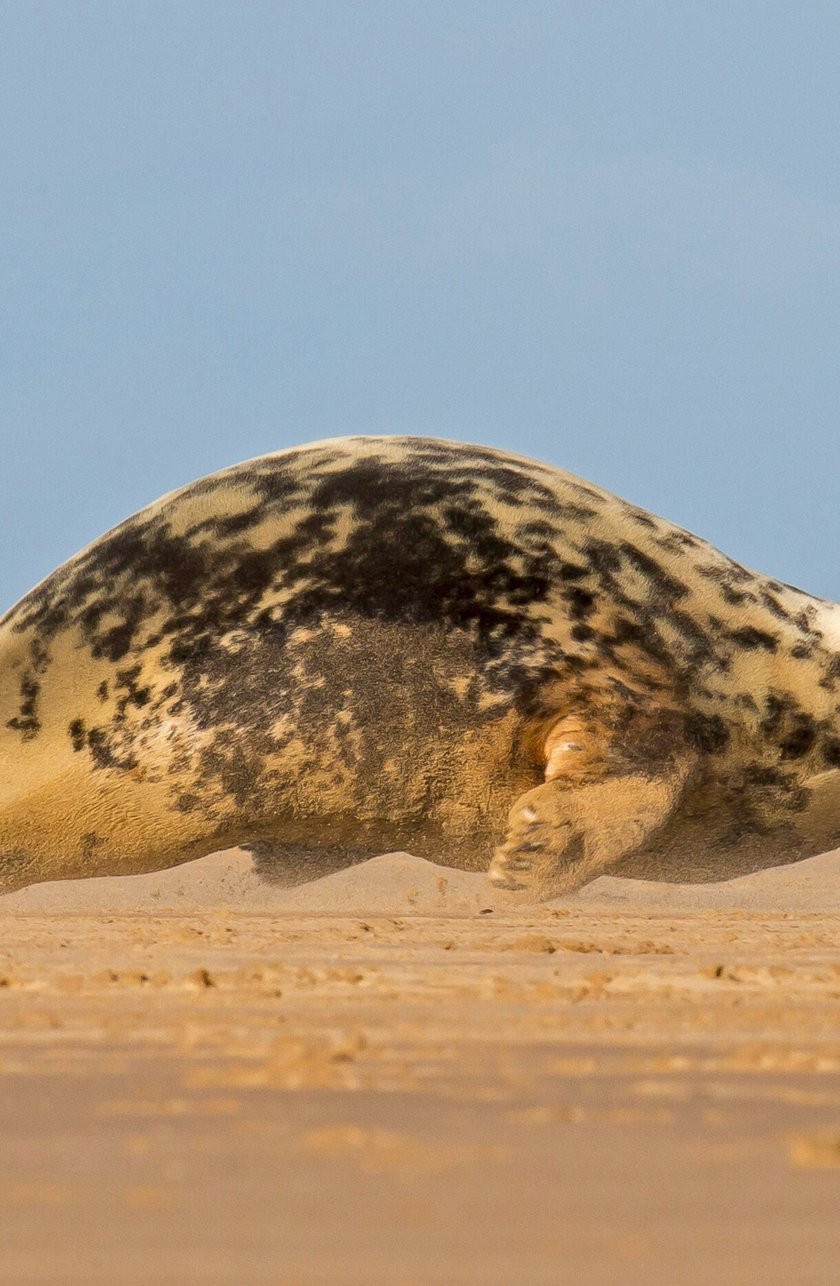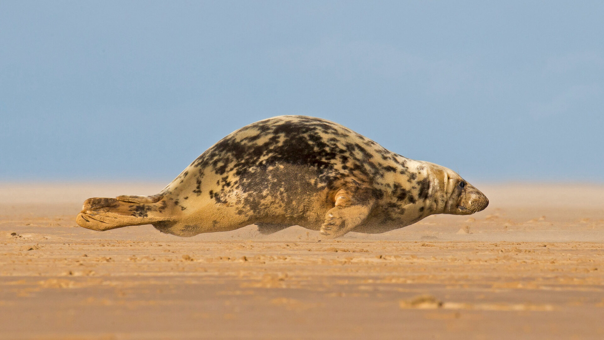 An engaging 4K wallpaper captures a mottled Grey Seal hitching across the expansive golden sand of Donna Nook Beach. The seal’s powerful, yet somewhat awkward movement kicks up fine sand, perfectly captured against the serene pale blue sky, emphasizing its determined journey.