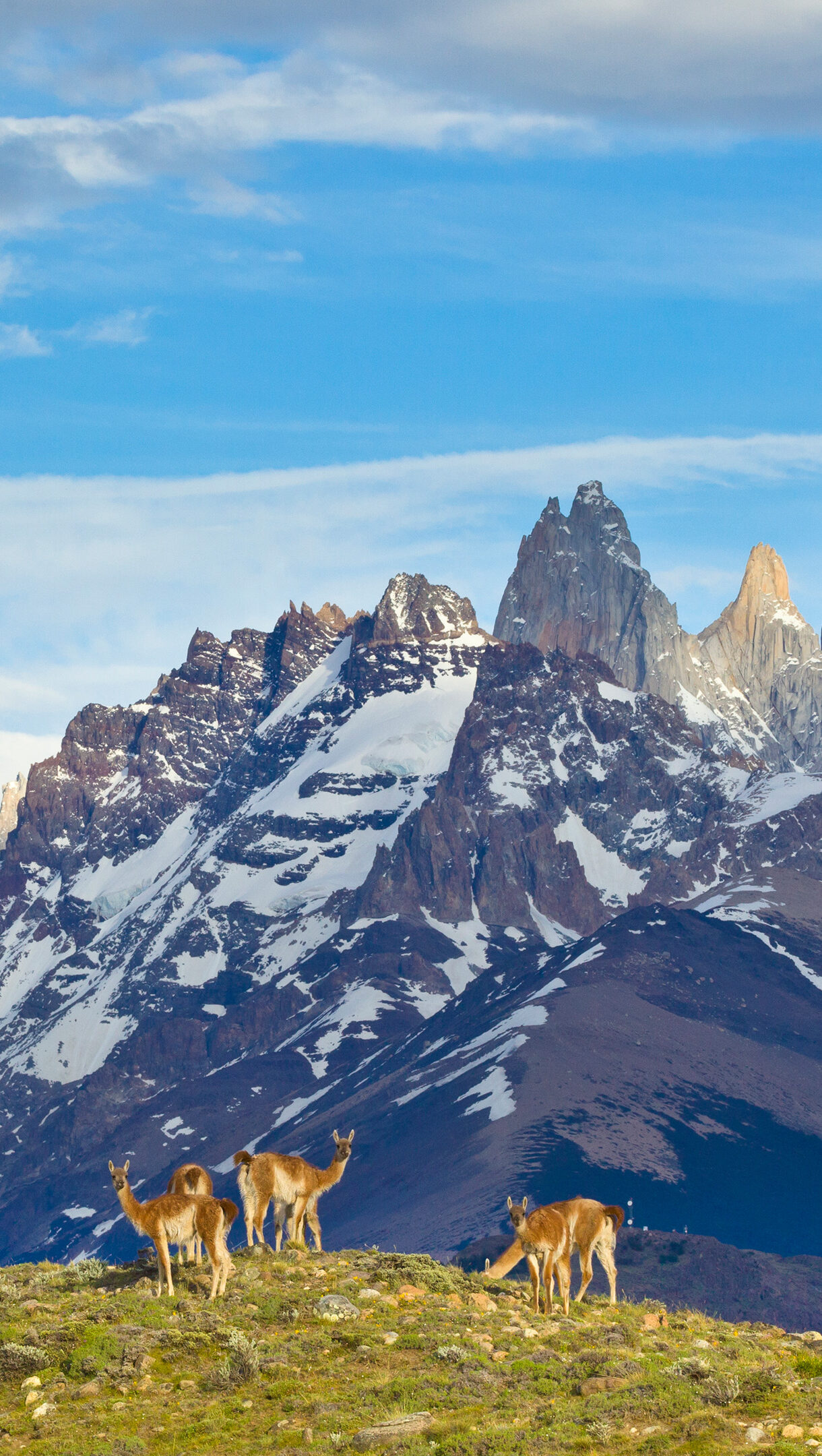 A breathtaking 4K wallpaper reveals a group of guanacos standing on a verdant hillside within the expansive Los Glaciares National Park in Patagonia, Argentina. The guanacos are dwarfed by the towering, snow-dusted peaks, with a prominent golden-hued mountain bathed in warm sunlight under a vivid blue sky, creating a majestic and serene landscape.