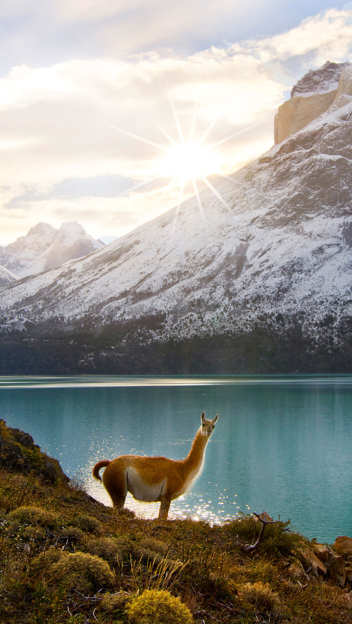 A breathtaking 4K wallpaper showcasing two guanacos perched on a golden hillside within Torres del Paine National Park. The vibrant turquoise lake reflects the majestic snow-capped mountains, while a brilliant sunburst illuminates the sky, creating a serene and grand spectacle.