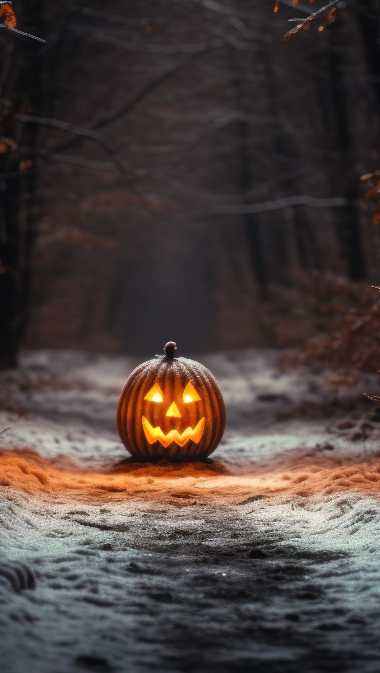 Venture into the spooky Halloween woods with this 4K wallpaper, featuring an AI-generated pumpkin. It's the perfect choice for your high-resolution desktop background during the eerie holiday season. Simply click the download button to bring this masterpiece to life on your screen as a desktop wallpaper or save it for later in your picture collection.