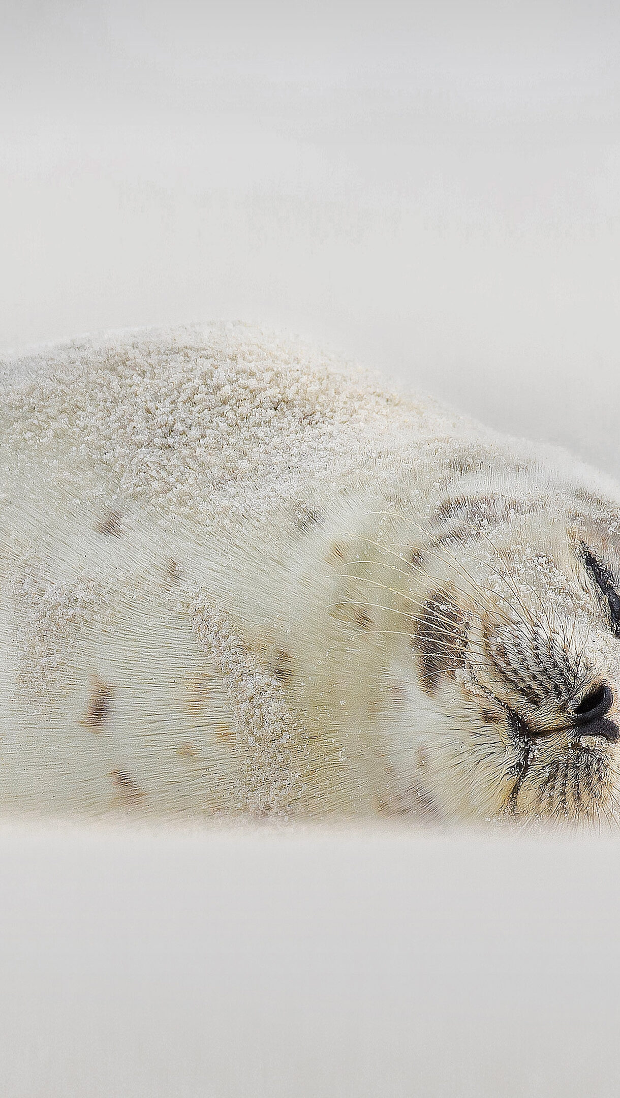 A serene 4K wallpaper showcases a Harp Seal sleeping peacefully on Jones Beach, Long Island, New York. Its pale, speckled fur, gently dusted with sand, blends almost seamlessly with the soft, ethereal background, evoking a profound sense of tranquility.