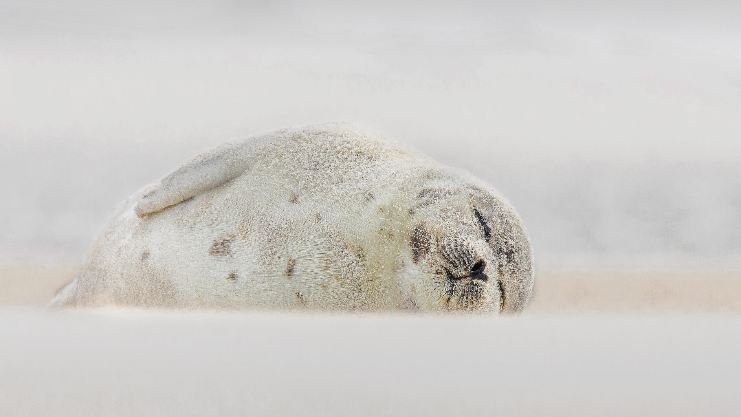 A serene 4K wallpaper showcases a Harp Seal sleeping peacefully on Jones Beach, Long Island, New York. Its pale, speckled fur, gently dusted with sand, blends almost seamlessly with the soft, ethereal background, evoking a profound sense of tranquility.