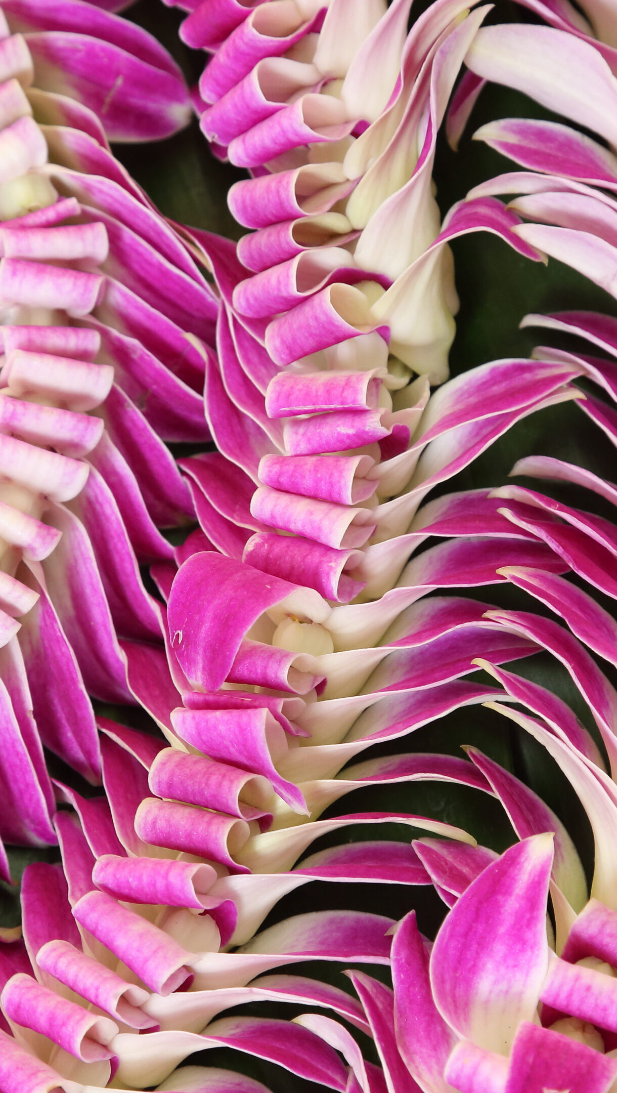 A captivating 4K wallpaper showcases a vibrant array of Hawaiian leis, meticulously crafted from intertwining pink and white orchid garlands. The exquisite contrast of deep fuchsia petals against soft white, intricately arranged in flowing curves and tight rolls, creates a luxurious and celebratory tropical feel.