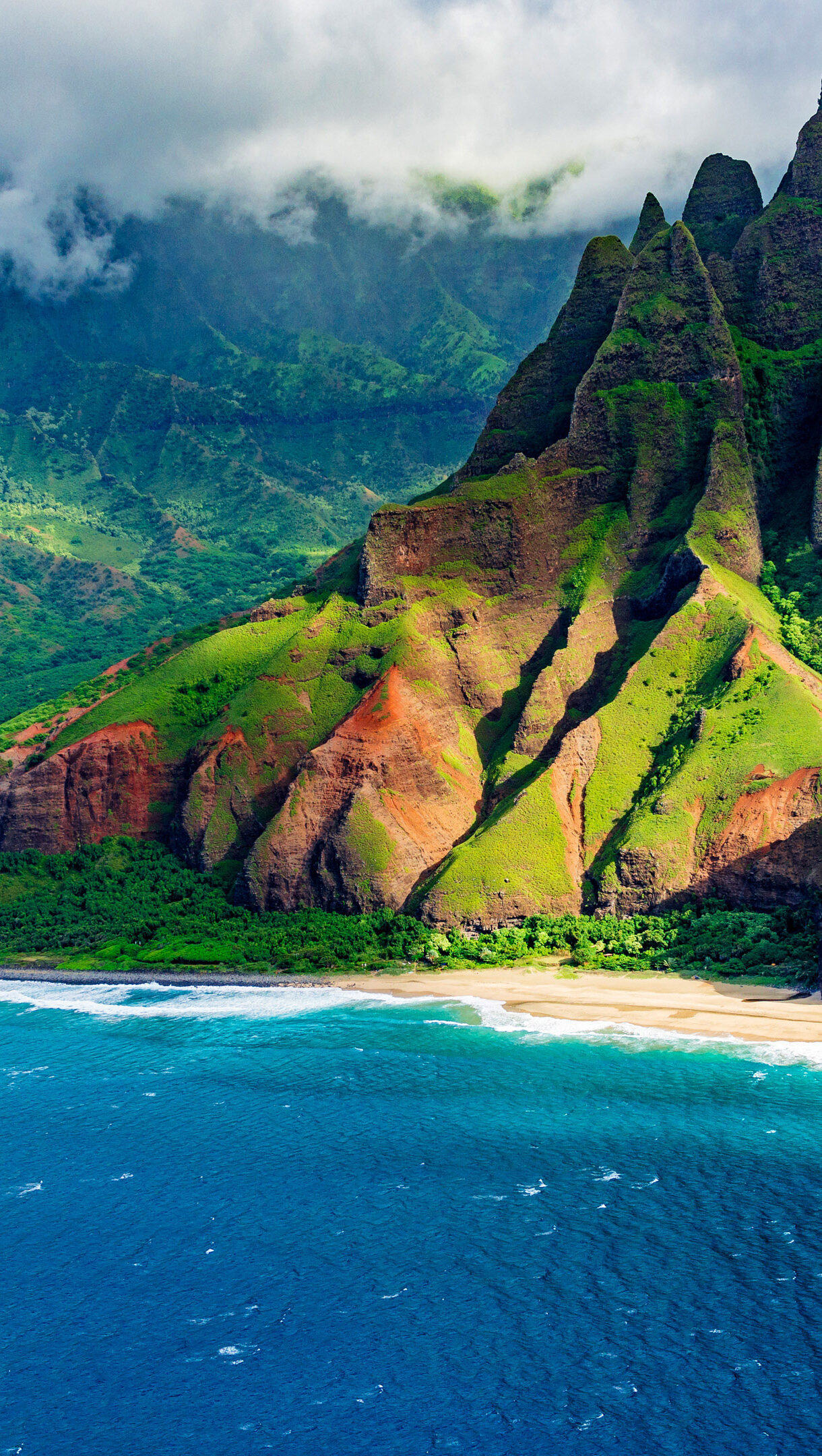 A breathtaking 4K wallpaper captures Hawaii’s majestic Na Pali Cliffs rising dramatically above Kalalau Beach and its vibrant turquoise waters. Sunlight illuminates the richly textured, emerald and ochre cliffs, contrasting beautifully with the deep azure ocean, creating an awe-inspiring natural vista.