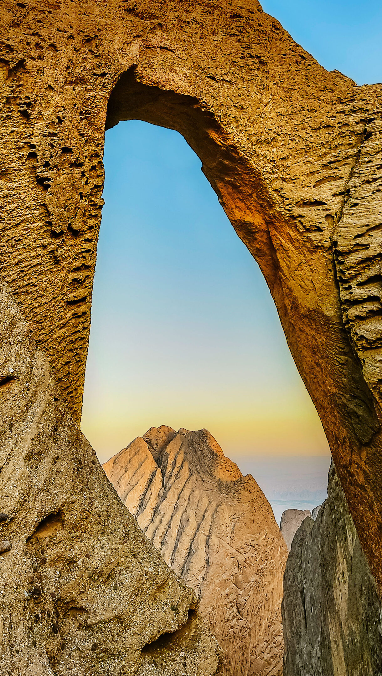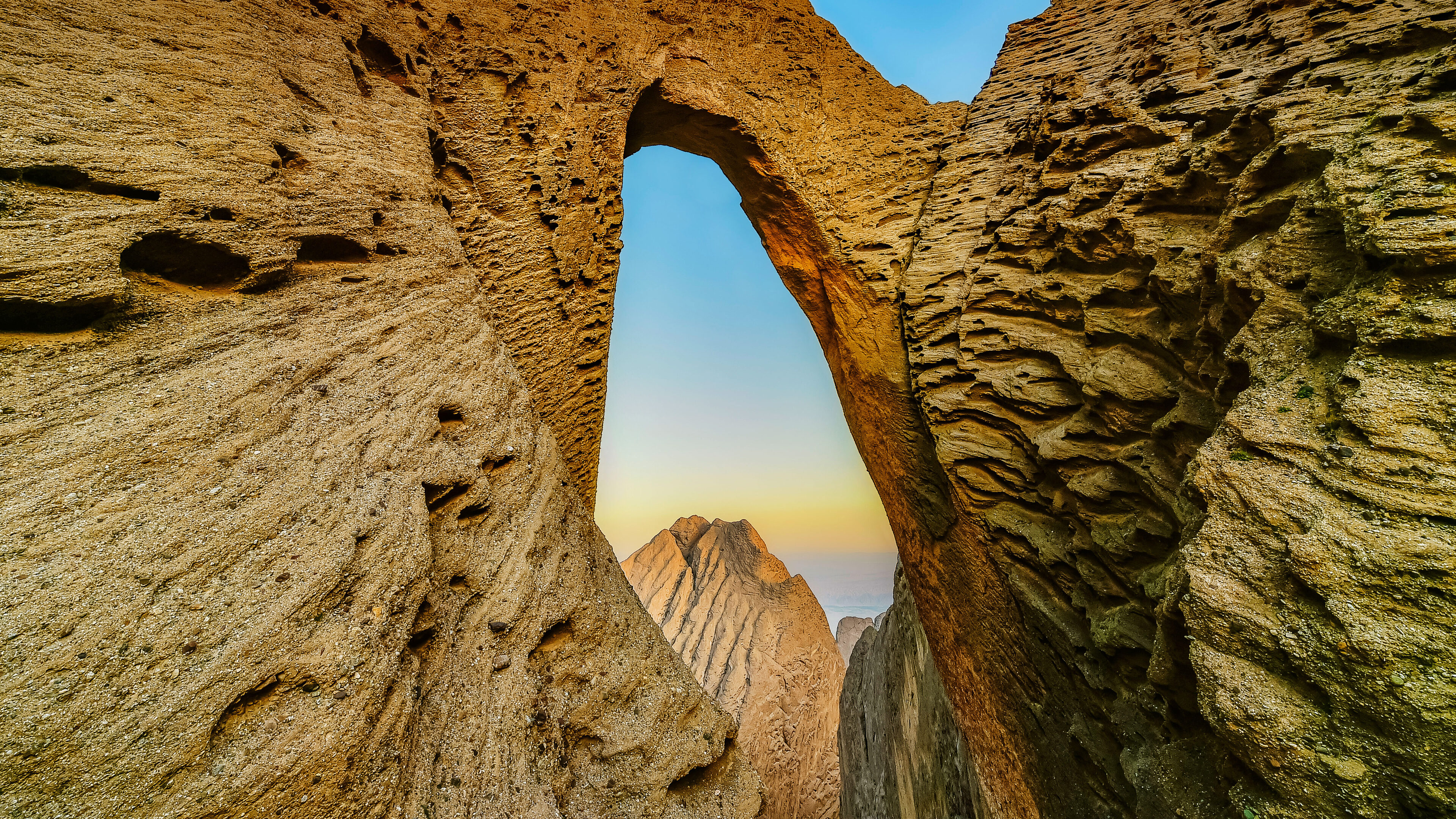 An epic 4K wallpaper captures Heaven's Gate Cave, a monumental natural rock arch within Tianmen Mountain, China. The dramatic, textured golden-brown rock formations frame a distant peak against a serene, gradient sky, evoking a profound sense of natural wonder and timelessness.