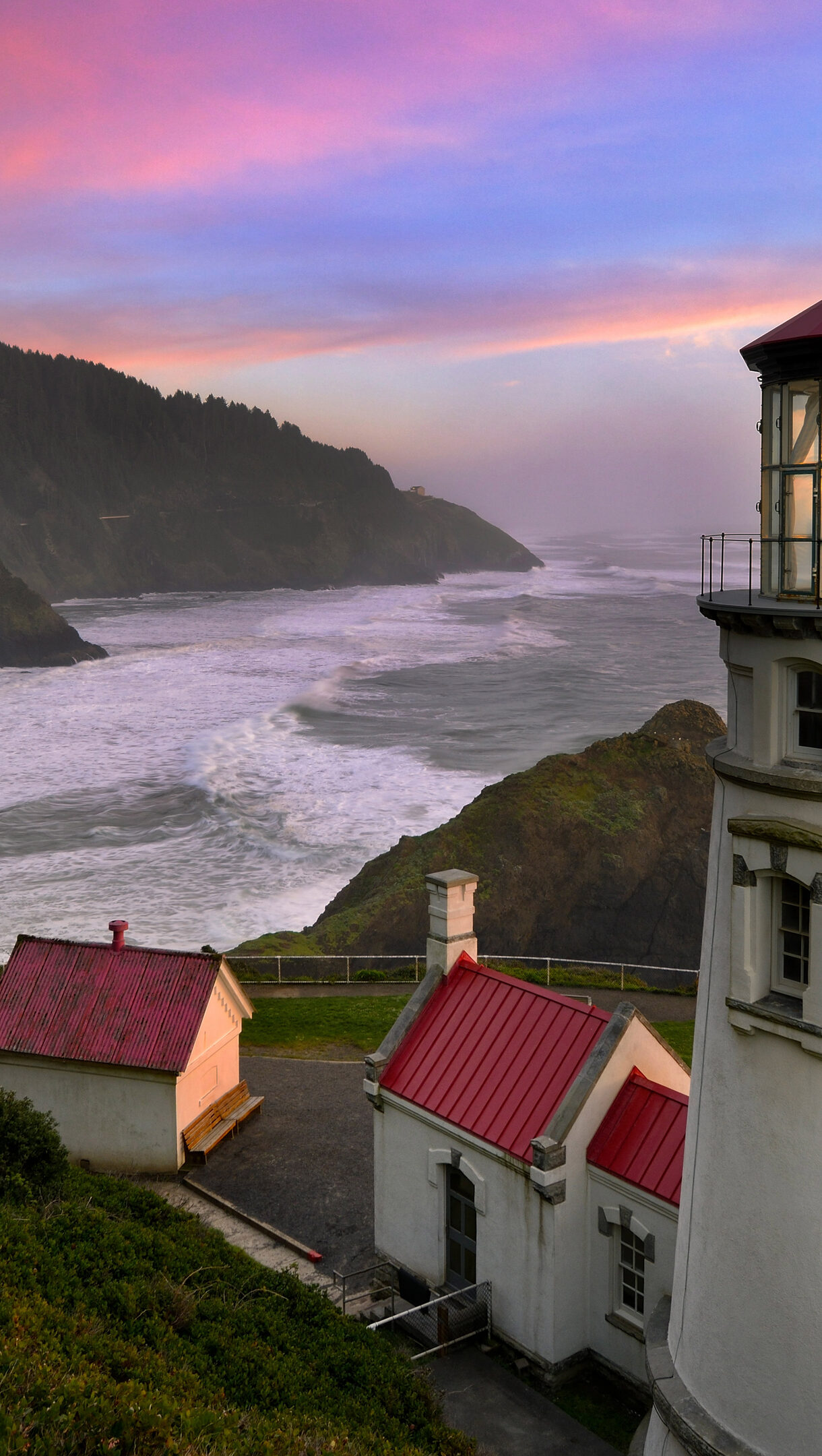 A captivating 4K wallpaper depicts the Heceta Head Lighthouse standing proudly on the Florence Oregon Coast at sunset. Its bright lamp illuminates the scene against a breathtaking sky streaked with fiery reds, purples, and blues, as foamy waves crash onto the shore below.