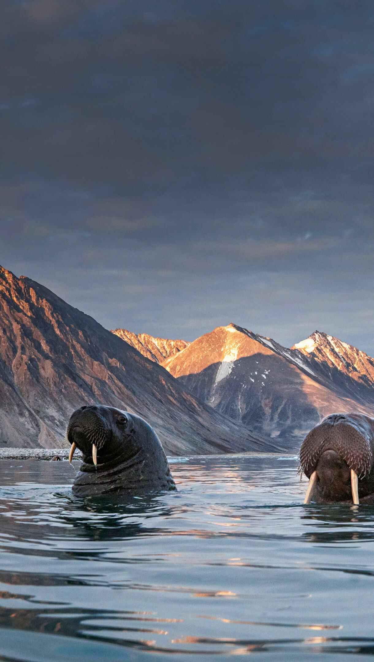 A breathtaking 4K wallpaper presenting a herd of walruses partially submerged in the cool waters off Northern Spitsbergen, set against a dramatic Arctic landscape of rugged mountains and glaciers. Warm, golden sunlight illuminates the distant mountain peaks, creating a stunning contrast with the moody, cloudy sky and the deep blue of the water, highlighting the majestic presence of the large tusked animals.