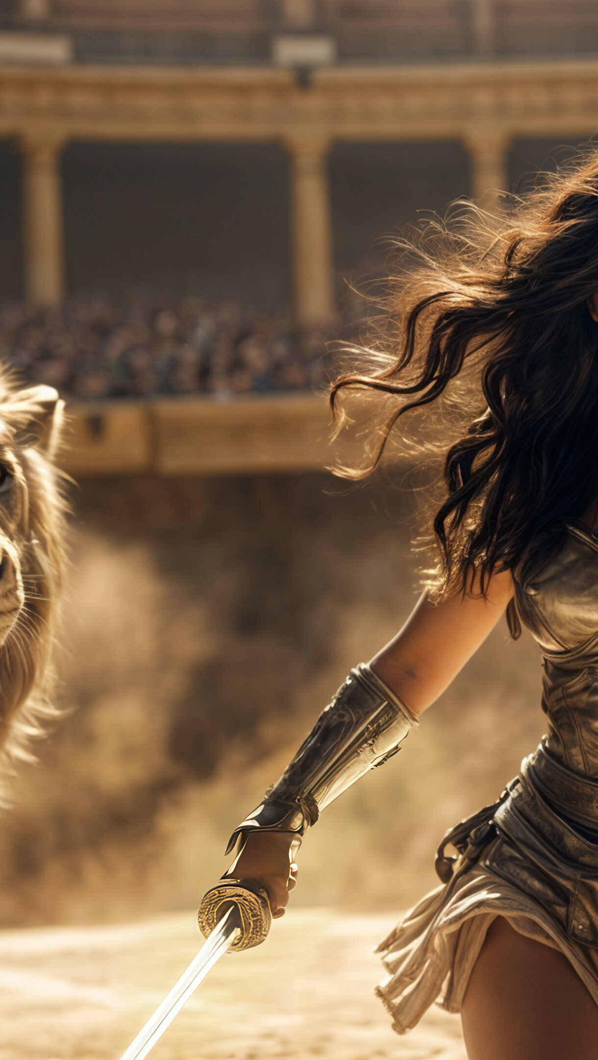 A stunning 4K wallpaper featuring a heroic woman standing fearlessly alongside a ferocious lion in a grand arena. The dramatic scene, rich in detail and atmosphere, captures the essence of bravery and power, making it an ideal choice for your desktop or mobile background.