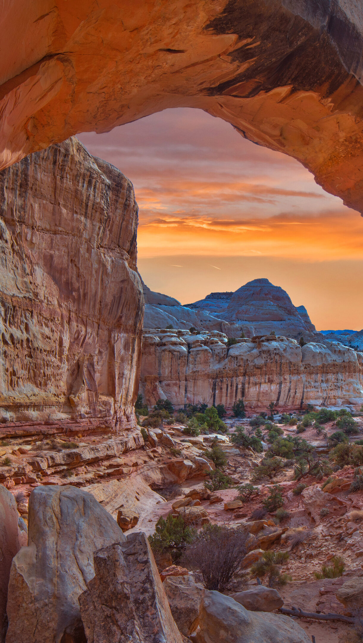 A breathtaking 4K wallpaper captures the magnificent Hickman Bridge natural sandstone arch in Capitol Reef National Park, Utah, framing a dramatic desert landscape beyond. The warm, reddish glow of the sunset permeates the towering arch and illuminates the distant white rock formations against a vibrant orange and pink sky.