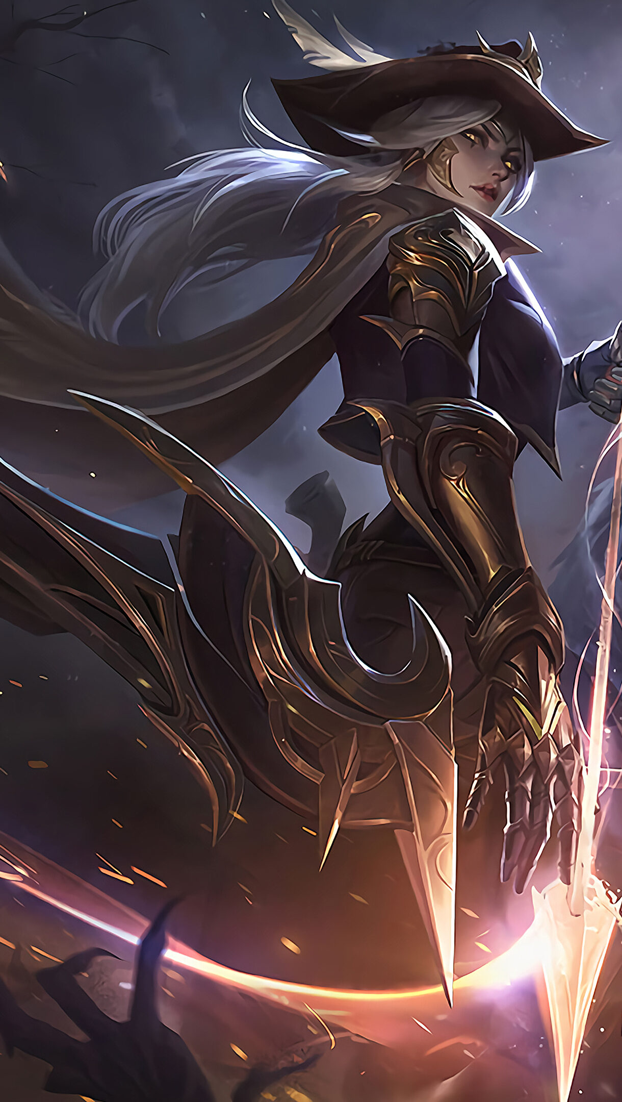 A captivating 4K wallpaper featuring the High Noon Ashe skin from League of Legends. Ashe, the Frost Archer, is depicted in her High Noon attire with fiery arrows ready to be unleashed. Simply click the download button to bring this masterpiece to life on your screen as a desktop wallpaper or save it for later in your picture collection.