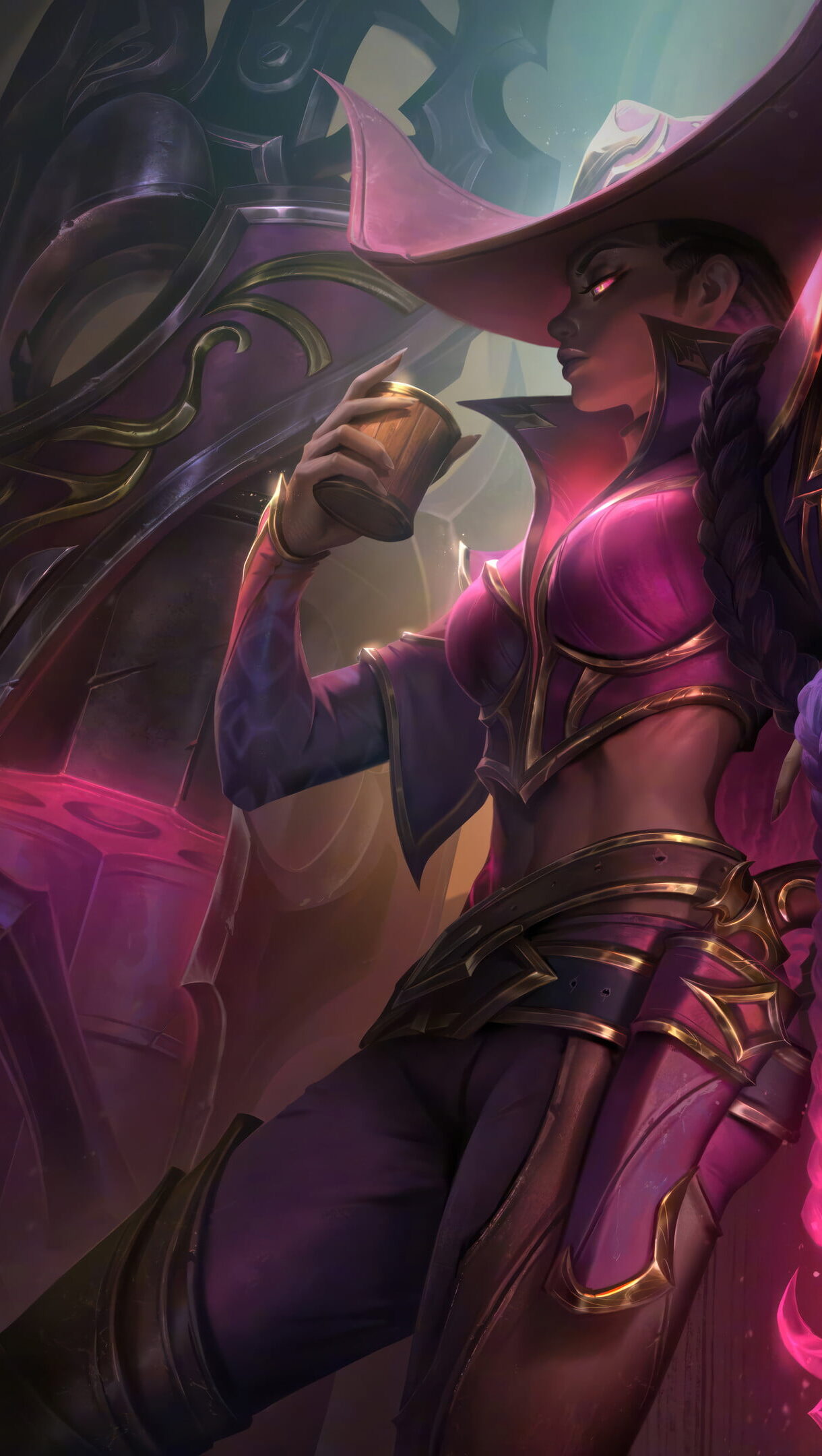 An entrancing 4K wallpaper featuring the High Noon Senna Rose Quartz Chroma skin, showcasing Senna, the Redeemer, adorned in a majestic ensemble, set against a striking backdrop in the thrilling realm of League of Legends. Simply click the download button to bring this masterpiece to life on your screen as a desktop wallpaper or save it for later in your picture collection.