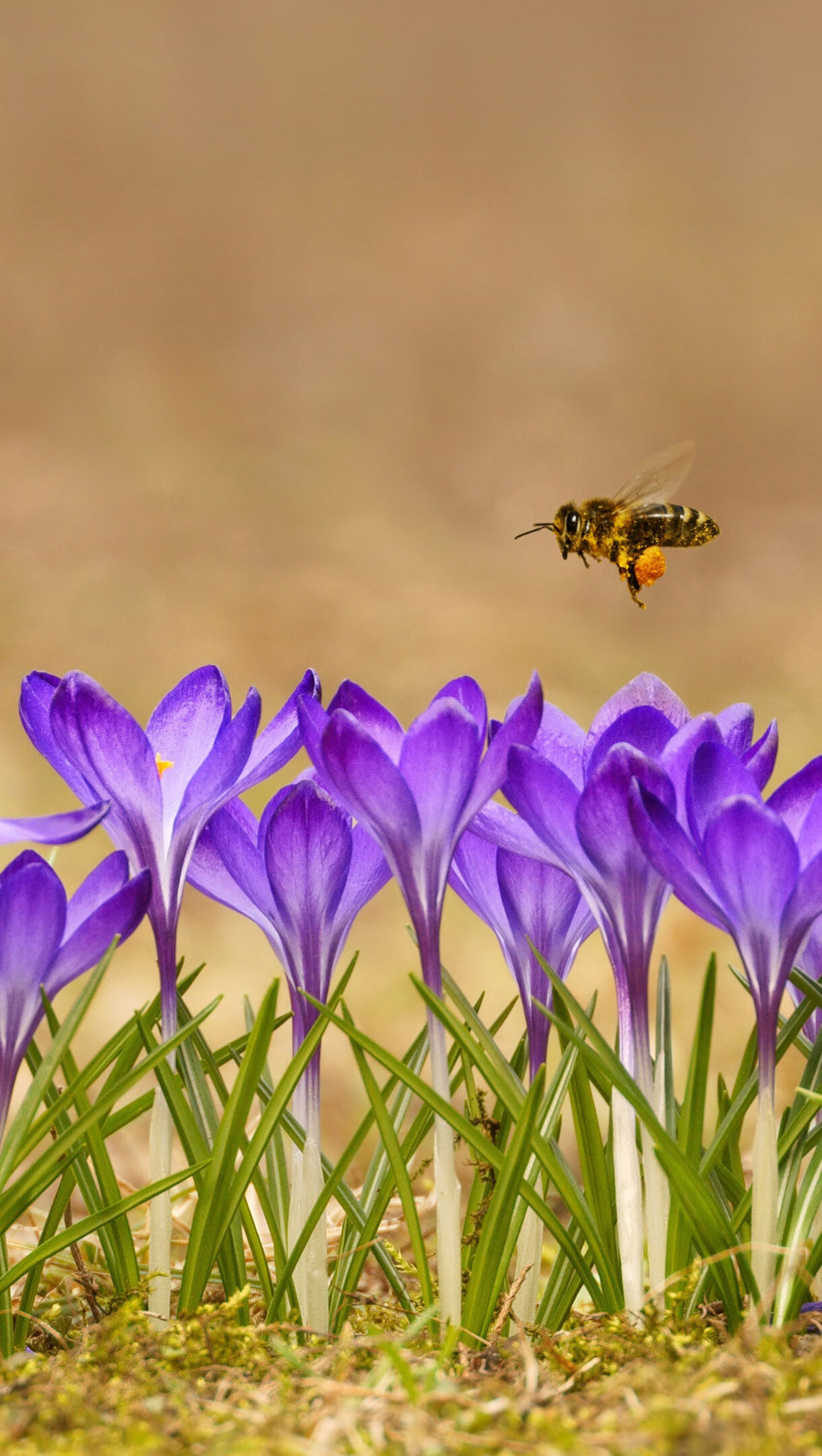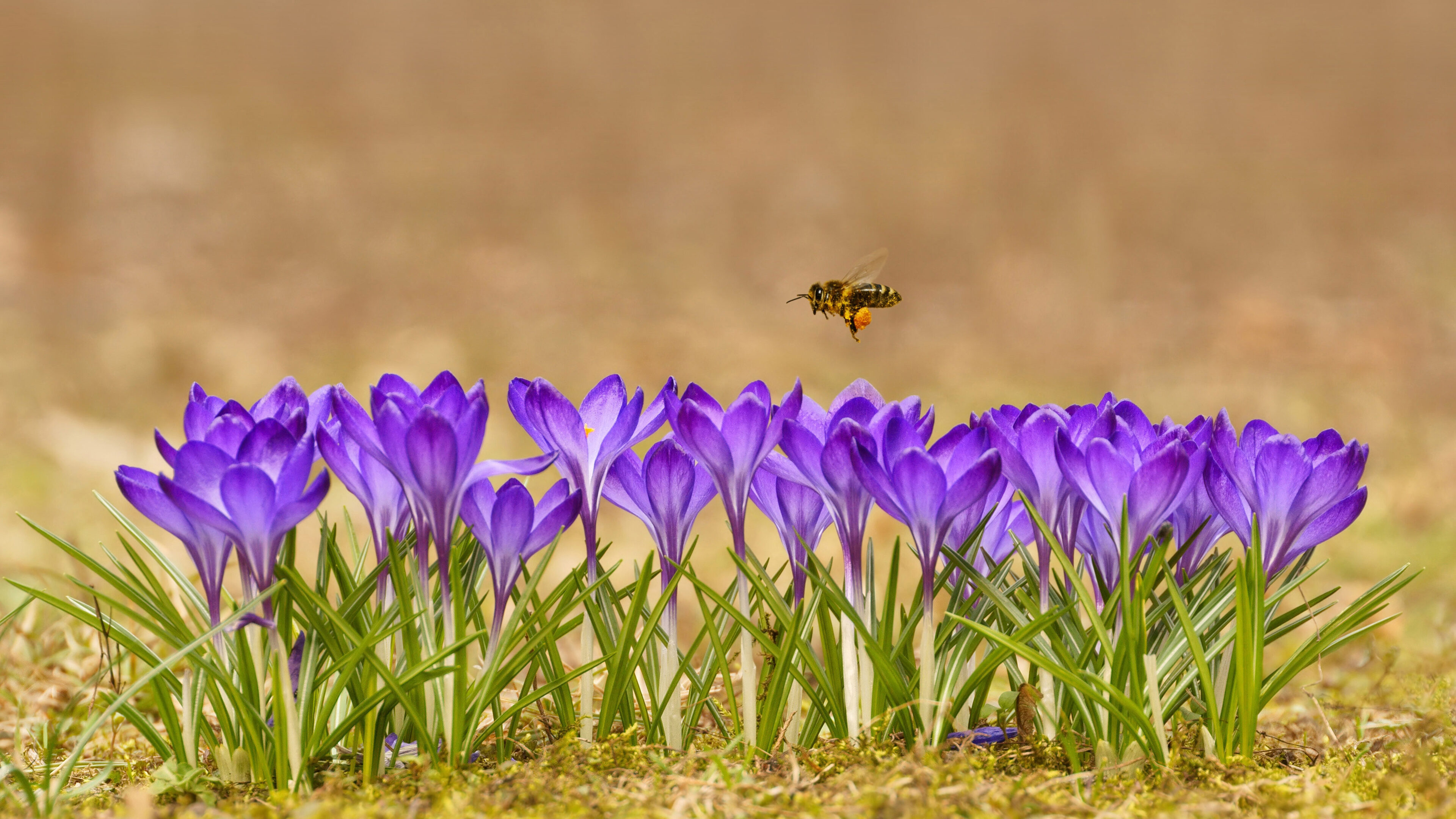 A captivating 4K wallpaper highlights a honey bee in mid-flight above a row of vivid purple crocuses, hinting at the expansive beauty of the Tatra Mountains. The bee's legs are visibly dusted with golden pollen, creating a lively contrast that embodies the vibrant renewal of spring.