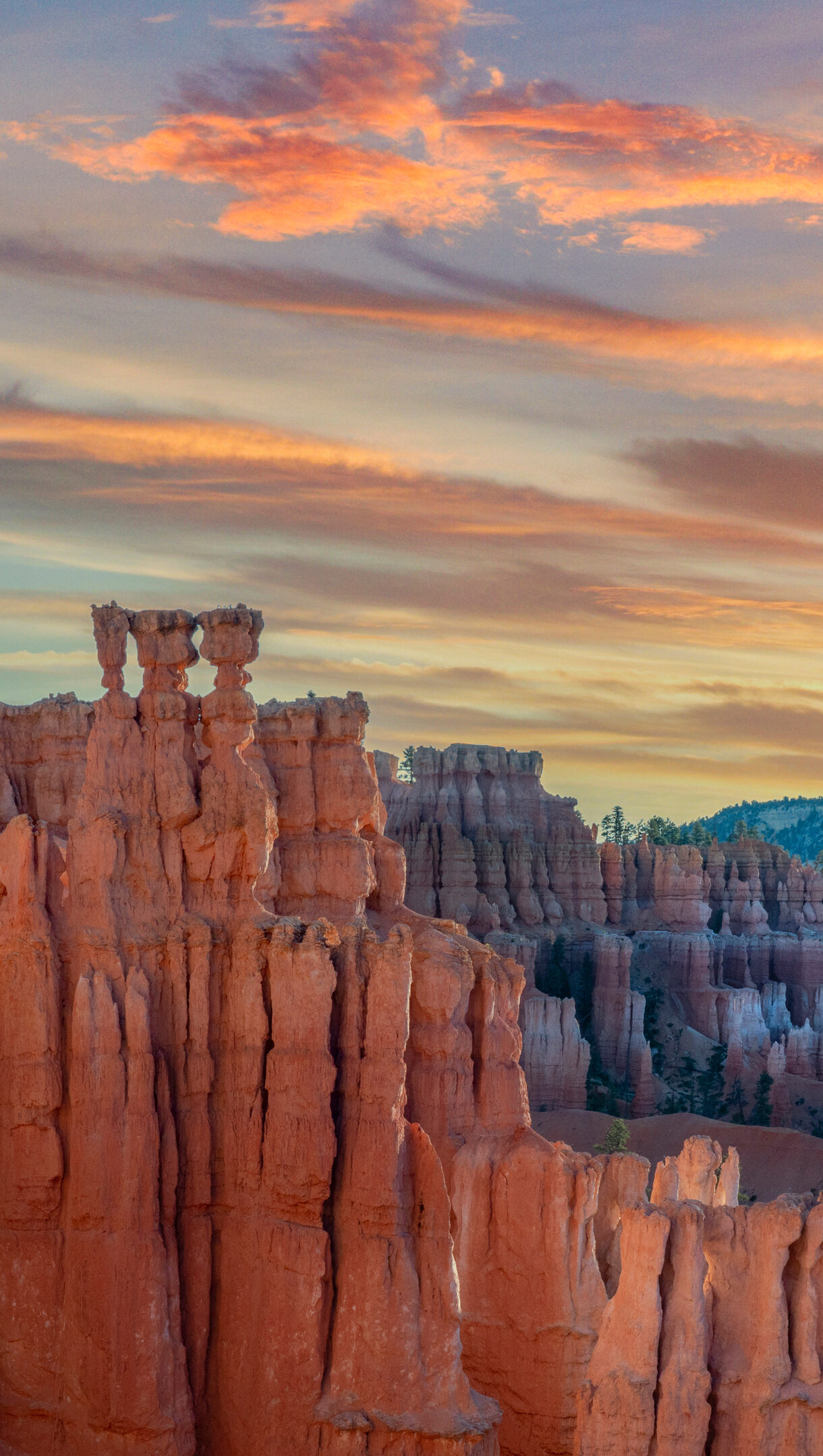 A breathtaking 4K wallpaper captures the majestic hoodoos of Bryce Canyon at Sunset Point, presenting a vast landscape of eroded rock formations under a vivid sky. The golden hour light bathes the unique orange and pink rock pillars, creating a dramatic contrast against the fiery, layered clouds streaking across the vast horizon.
