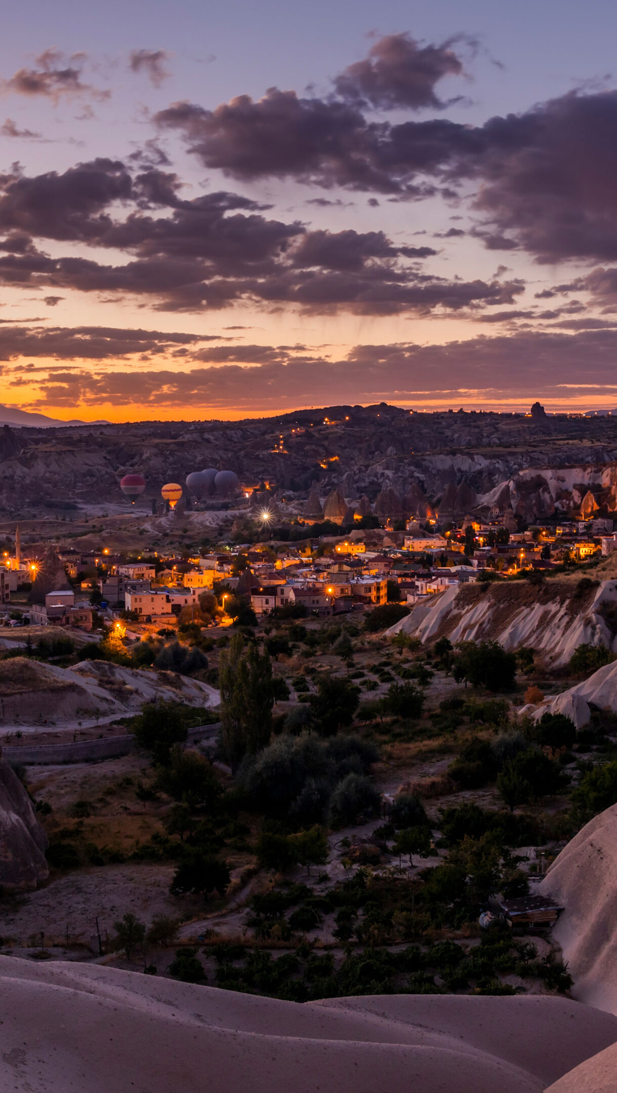 A magical 4K wallpaper of hot air balloons gracefully ascending over the illuminated town of Goreme in Cappadocia. The dramatic sunset paints the sky with hues of orange and purple, casting a warm glow over the distinctive fairy chimneys and the twinkling city lights below.