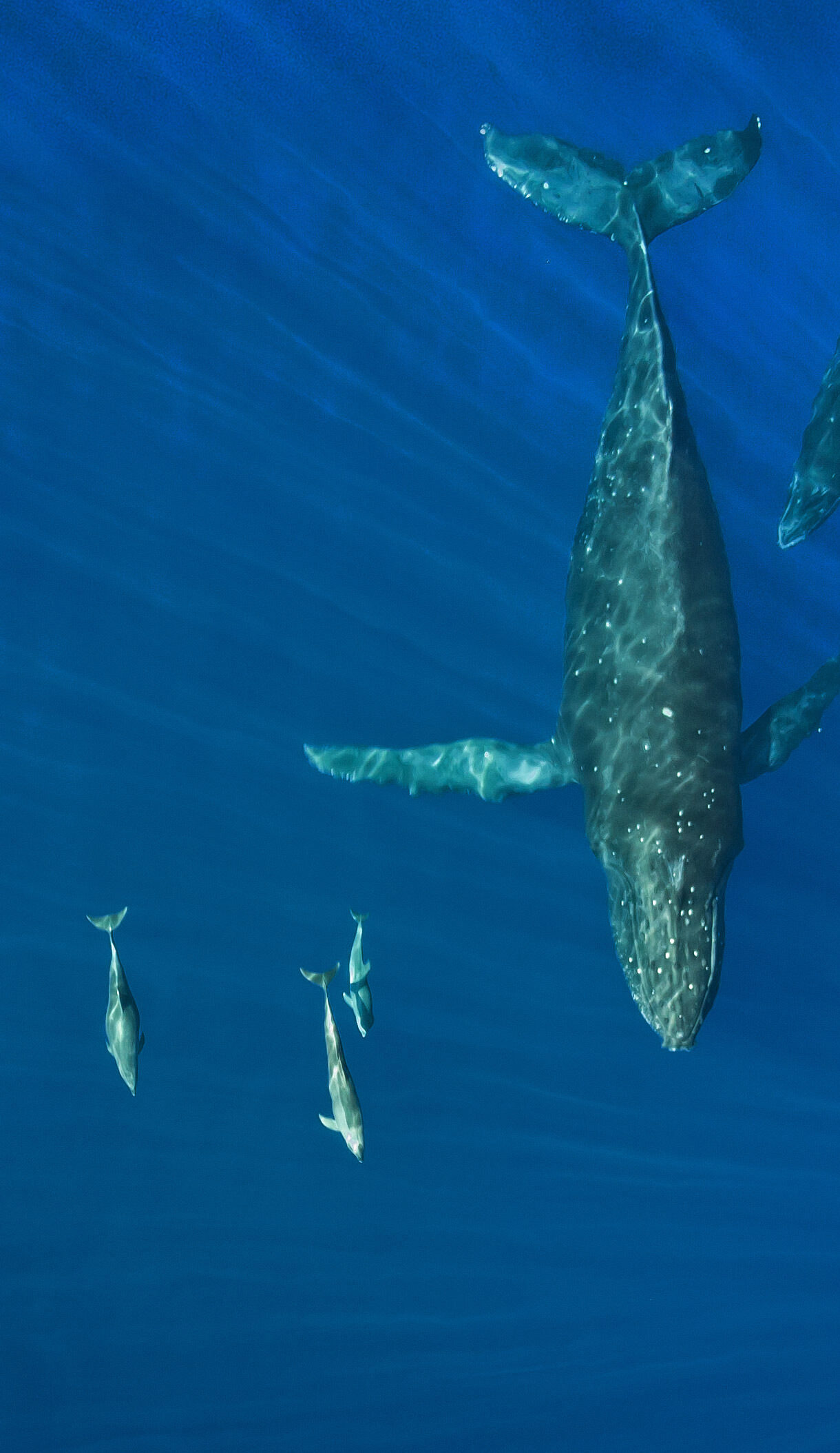 An enchanting 4K wallpaper capturing a humpback whale and several dolphins swimming gracefully together in the deep blue underwater world of Hawaii. Sunlight filters down from above, creating a mesmerizing play of shimmering light patterns on their bodies and the tranquil ocean surface.