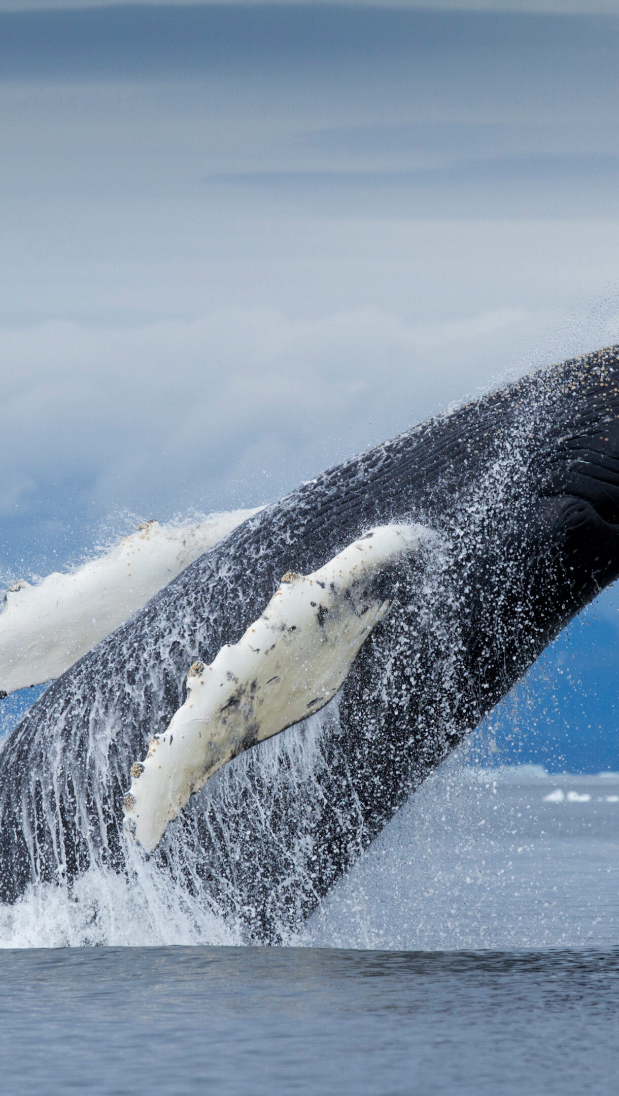 A majestic 4K wallpaper presents a humpback whale explosively breaching from the cold waters of Disko Bay, Greenland, against a backdrop of distant icebergs and a cloudy sky. Water cascades dramatically around its powerful dark body and long white flippers, emphasizing the raw energy and wild beauty of the Arctic seascape under a soft, diffused light.