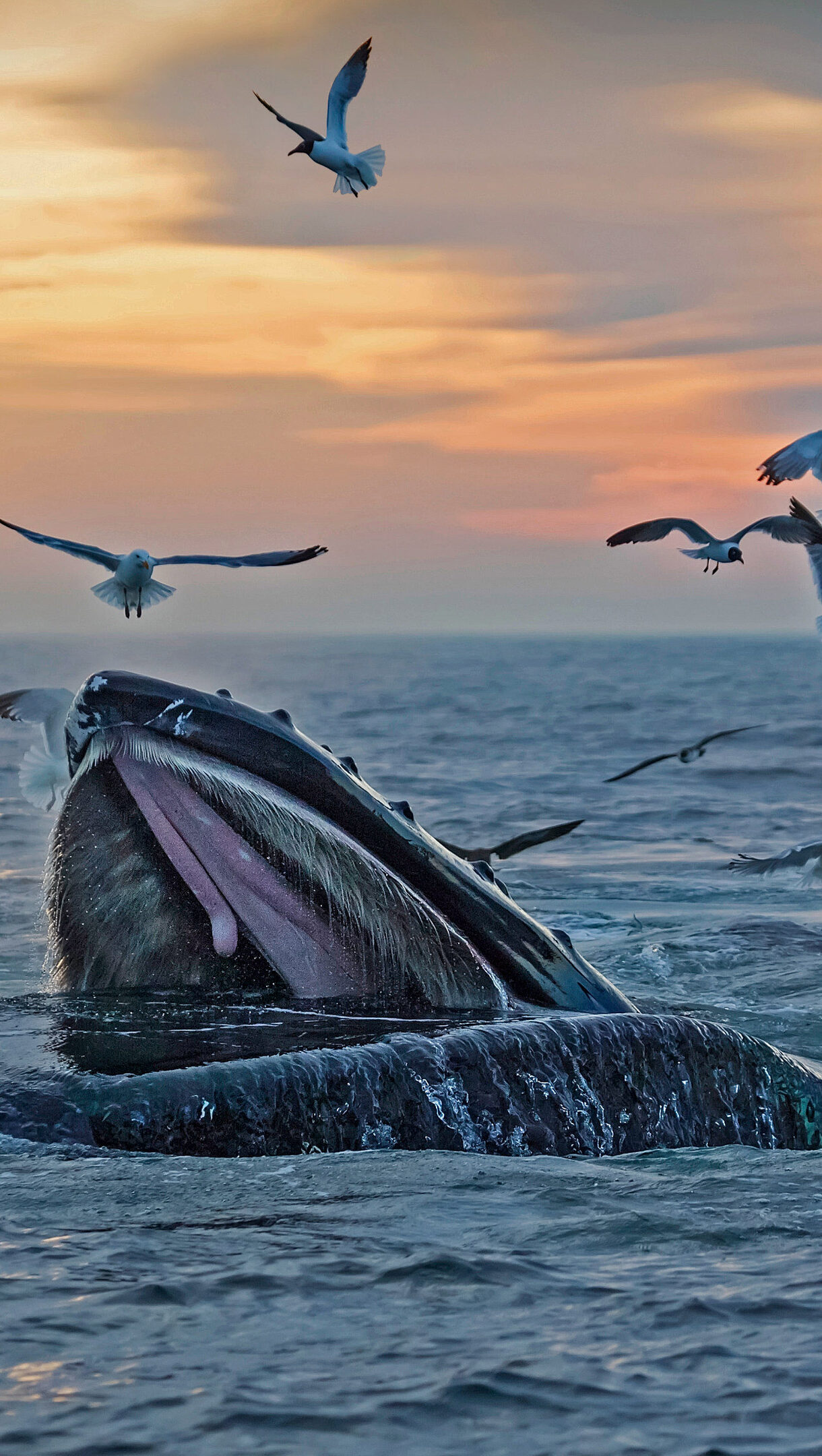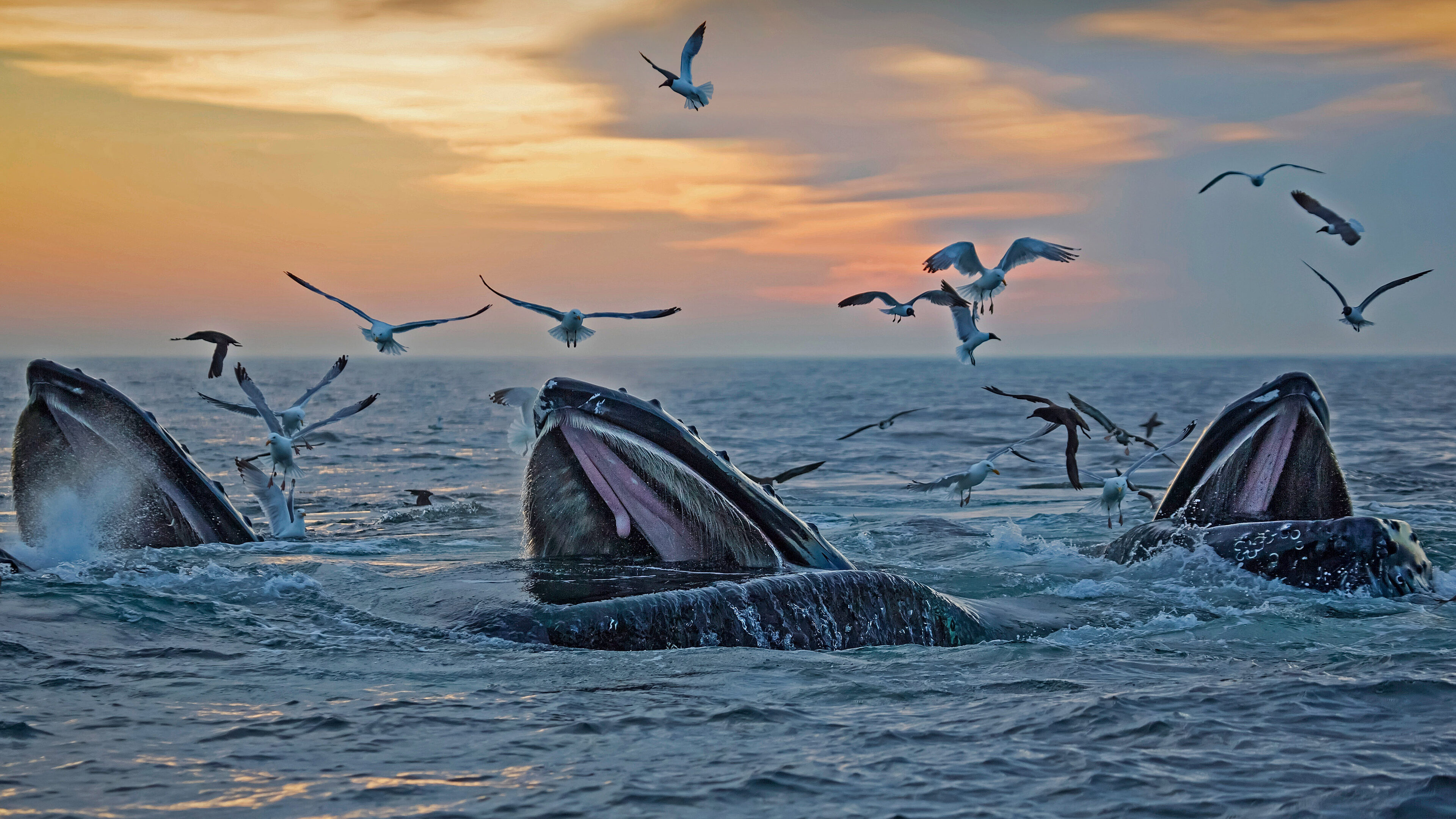 A captivating 4K wallpaper showcases humpback whales actively feeding off the Massachusetts Coast at sunset. Their massive mouths emerge from the ocean amidst a flurry of surrounding seagulls, bathed in the soft, golden light of the fading sun.