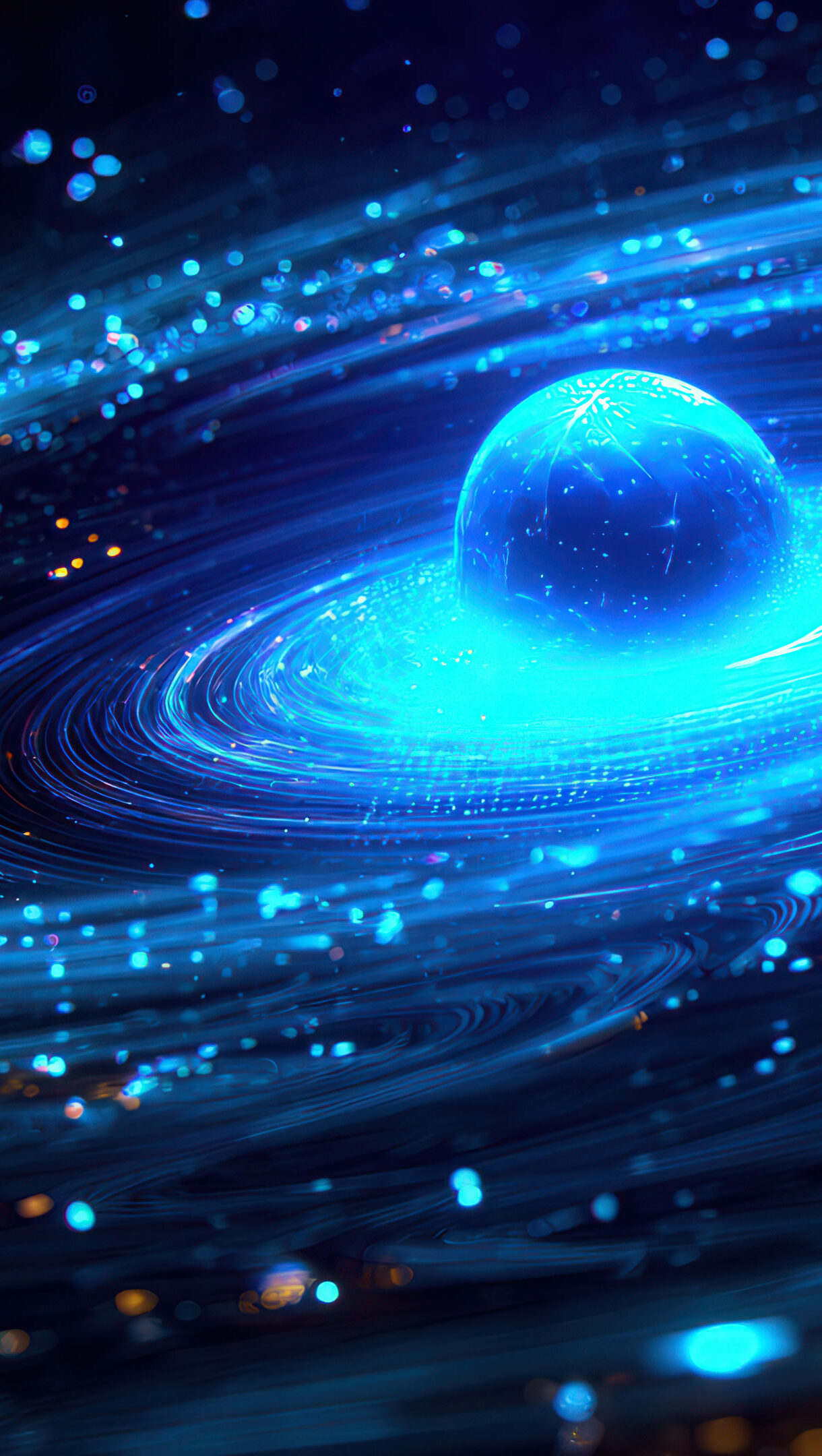 A hypnotic 4K wallpaper capturing a brilliant, spherical blue energy orb centered within a mesmerizing, swirling vortex of light in the depths of space. The intense azure glow of the orb radiates outward, forming dynamic spiraling trails of luminescent particles interwoven with scattered points of golden light, creating a profound sense of cosmic motion and power.