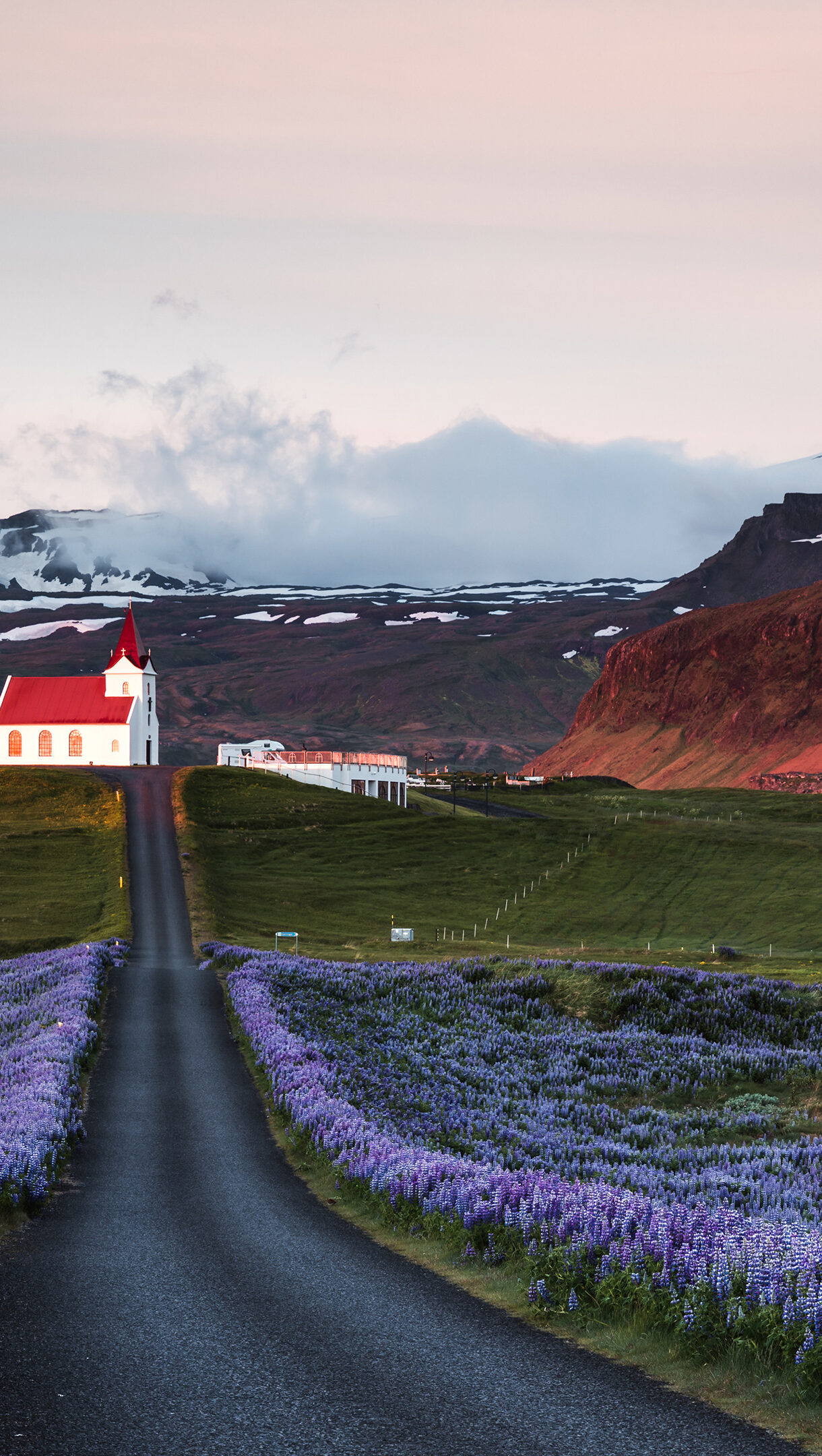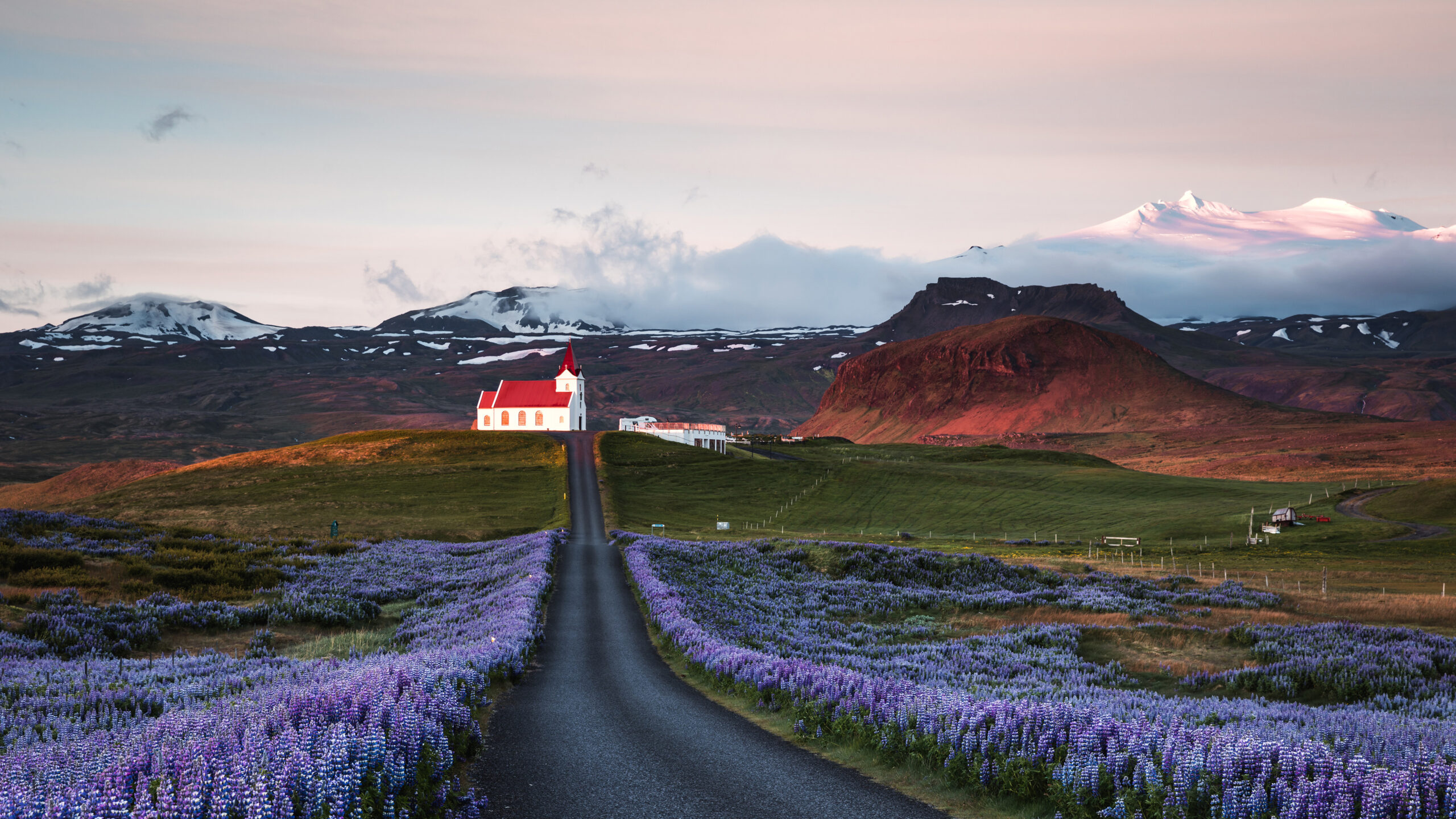 A serene 4K wallpaper captures the iconic red-roofed church nestled amidst vast purple Iceland lupine fields, with a road leading towards it under a sunrise sky. The golden glow of the rising sun bathes the church's striking red roof and distant snow-capped mountains in a soft light, creating a tranquil and majestic morning scene.