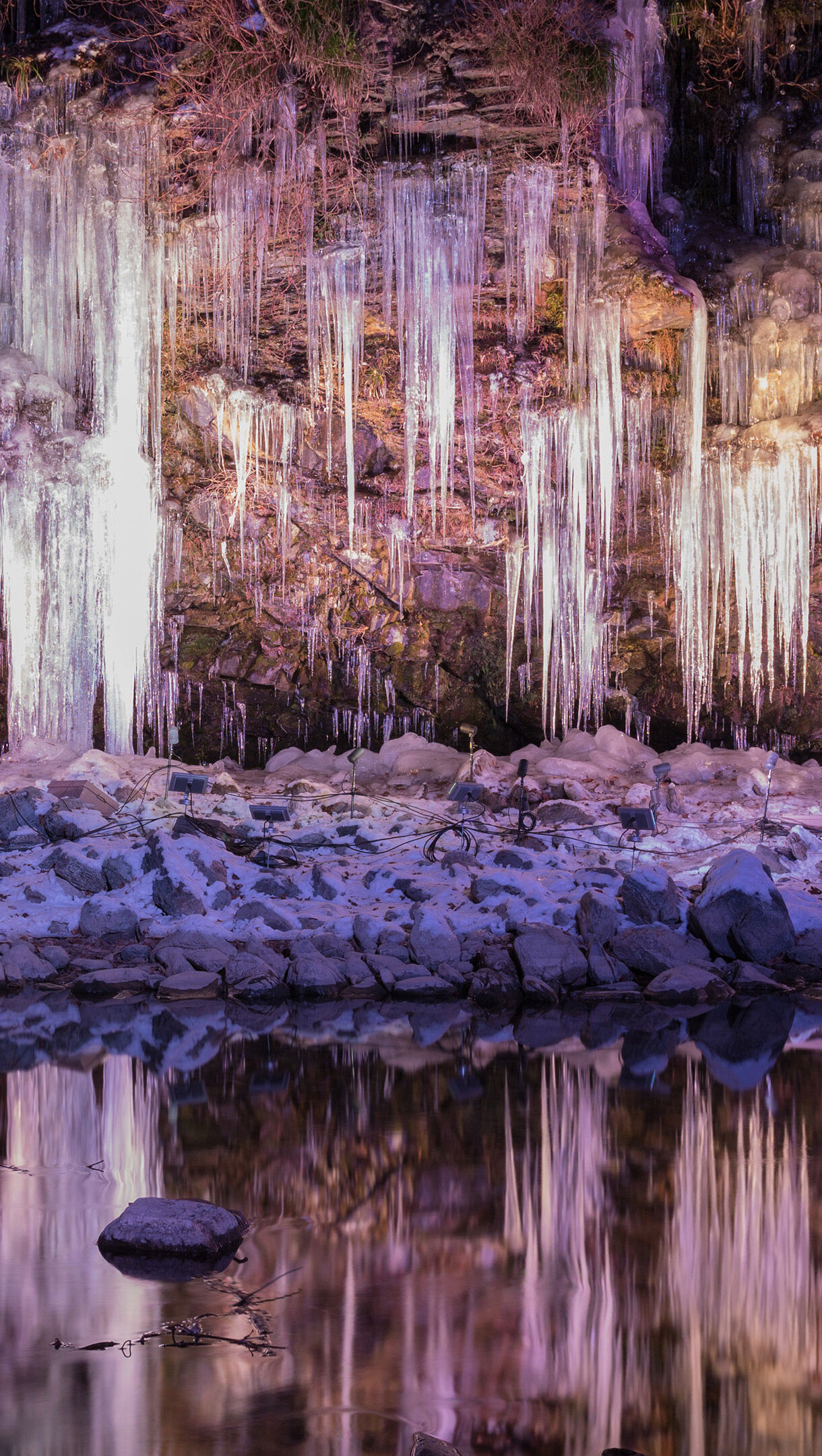 A magical 4K wallpaper of the Illuminated Misotsuchi Icicles cascading down a winter cliff in Chichibu. The brilliant purple and white illumination on the icicles creates a stunning reflection in the tranquil water below.