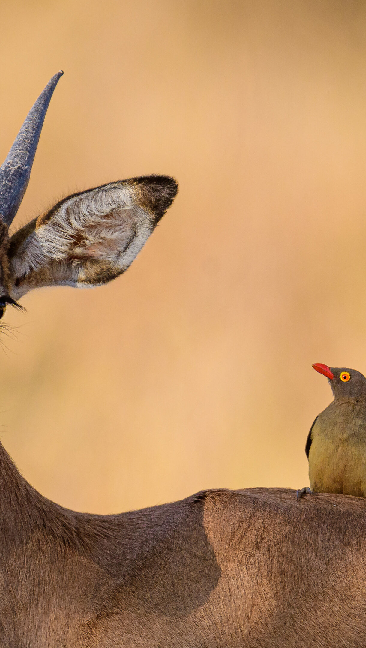 An exquisite 4K wallpaper showcasing a graceful impala gazing forward, with a vibrant Red-billed Oxpecker perched serenely on its back in a sun-drenched, natural landscape. The impala's soft brown fur and elegant horns are beautifully illuminated by warm golden light, highlighting the oxpecker's distinctive red beak and bright yellow eyes against the softly blurred, arid backdrop.