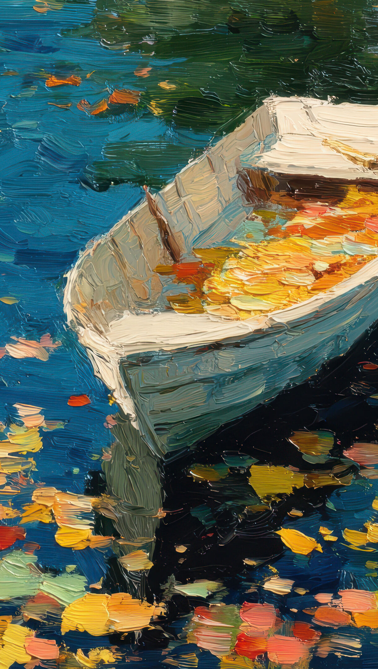 A captivating 4K wallpaper presents an Impressionist painting of a white boat gently floating on vibrant blue water. The boat is filled with and surrounded by a brilliant scattering of richly textured fall leaves, their warm oranges and yellows contrasting with the cool, deep blues and greens of the water, creating a tranquil autumnal scene.