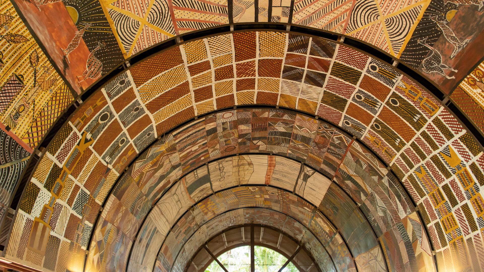 A stunning 4K wallpaper of an expansive arched ceiling adorned with intricate Indigenous Aboriginal art patterns. The diverse collection of abstract designs, featuring dot paintings and cross-hatching in earthy ochre, red, yellow, and black, creates a vibrant, culturally rich tapestry overhead.