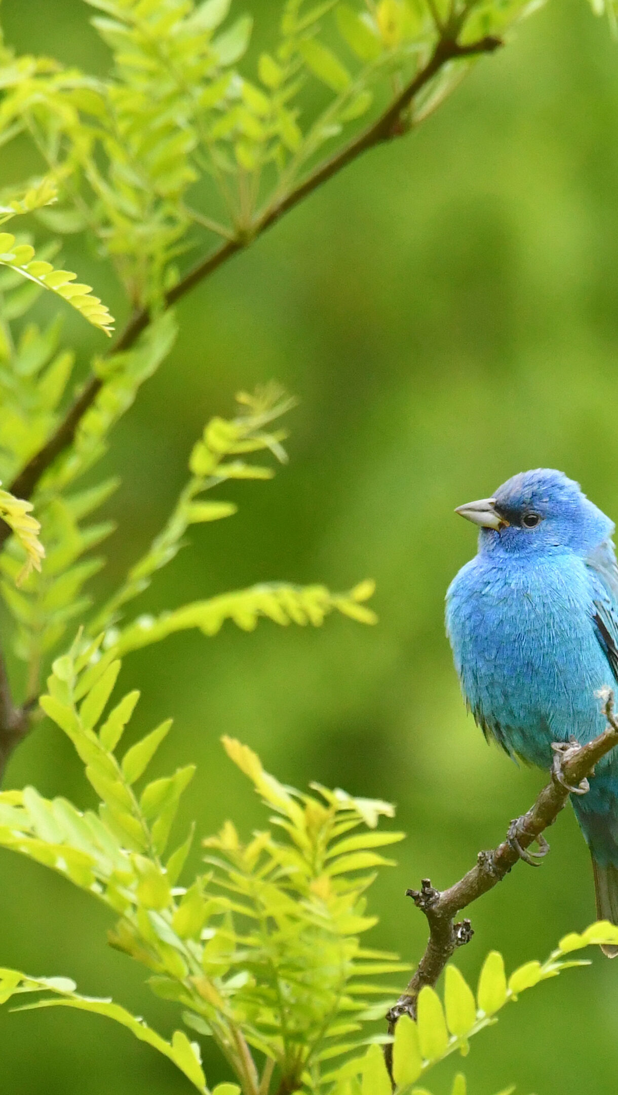 A striking 4K wallpaper showcasing an Indigo Bunting perched gracefully on a slender branch amidst the lush green foliage of Texas. The bird's vivid, iridescent blue plumage stands out brilliantly against the soft, verdant backdrop, creating a serene wildlife scene.