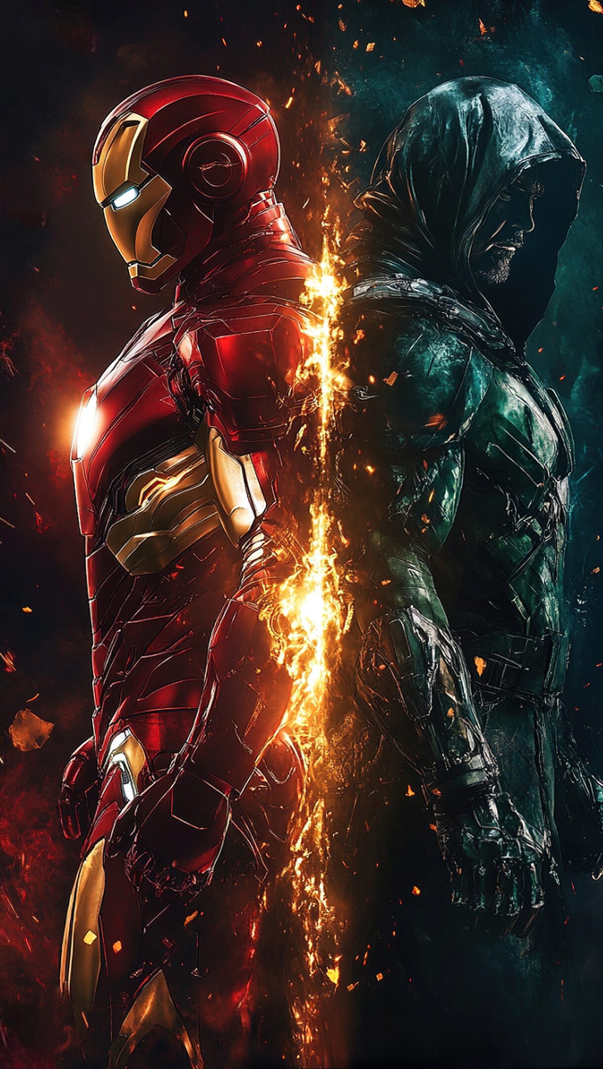 A captivating 4K wallpaper featuring Iron Man and Doctor Doom in an intense face-off. The high-resolution image showcases the detailed armor of both iconic Marvel characters, perfect for adding a dynamic and powerful scene to your desktop or mobile background.