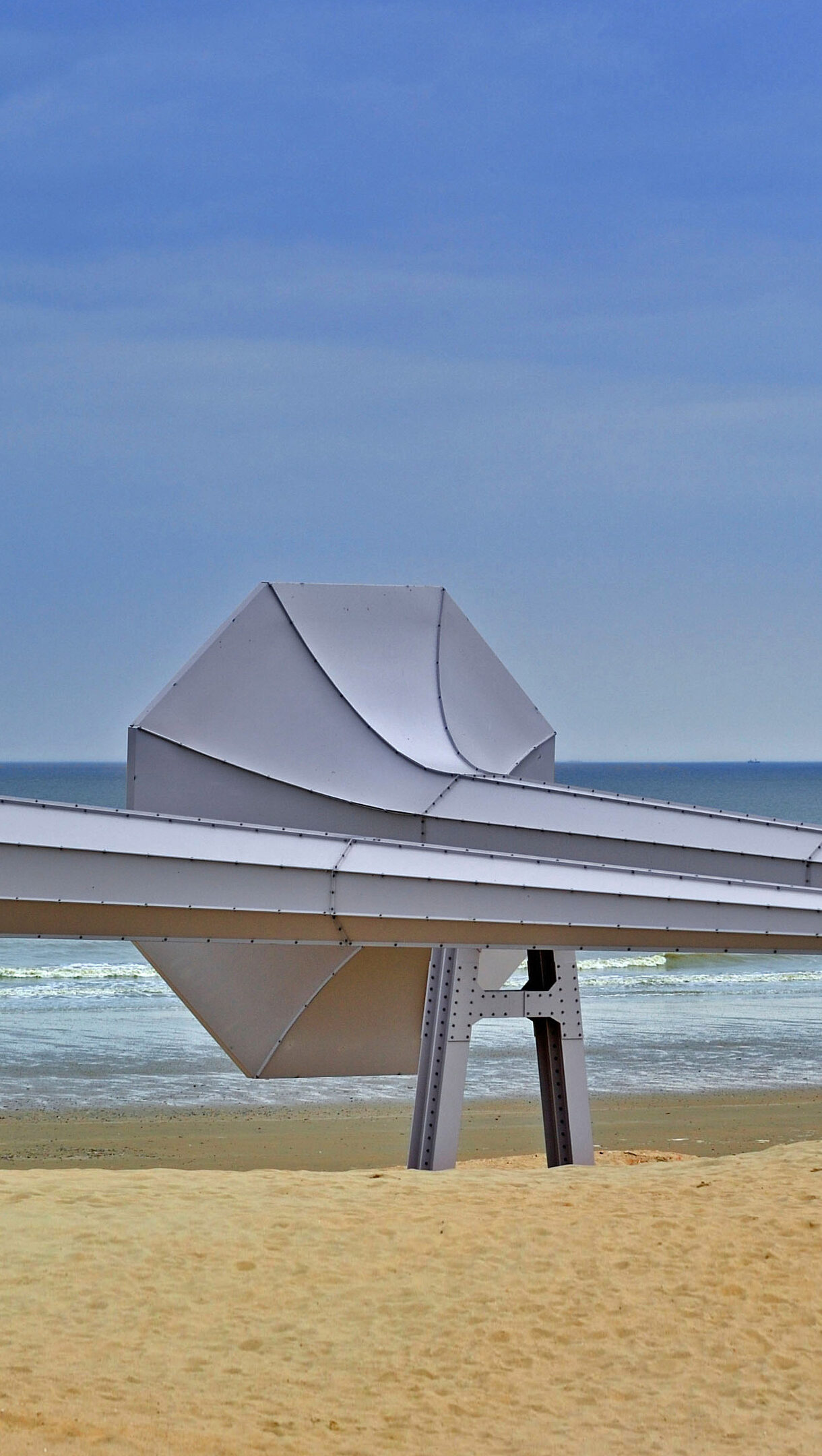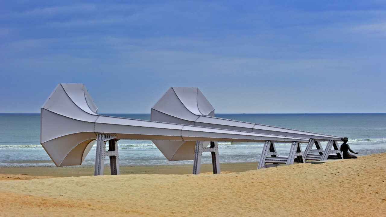 An intriguing 4K wallpaper presents Ivars Drulle's monumental gray art installation, a series of connected horn-like structures, stretching across a vast sandy beach towards the calm ocean. A solitary dark figure sits at the installation's end, quietly observing the expansive seascape under a soft blue sky.