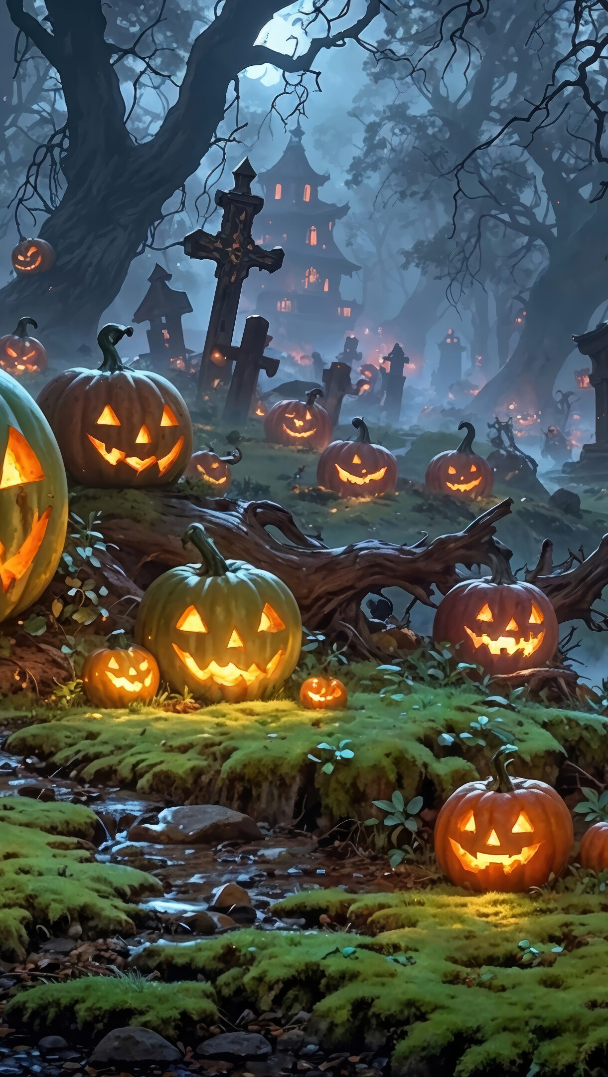 An enchanting 4K wallpaper showcases numerous glowing Jack-o'-lanterns scattered throughout a misty, haunted forest graveyard, embodying the spirit of Halloween digital art. The warm, flickering orange light from the carved pumpkins casts an otherworldly glow on the dark, gnarled trees and ancient gravestones, creating a mysterious and festive yet eerie mood.