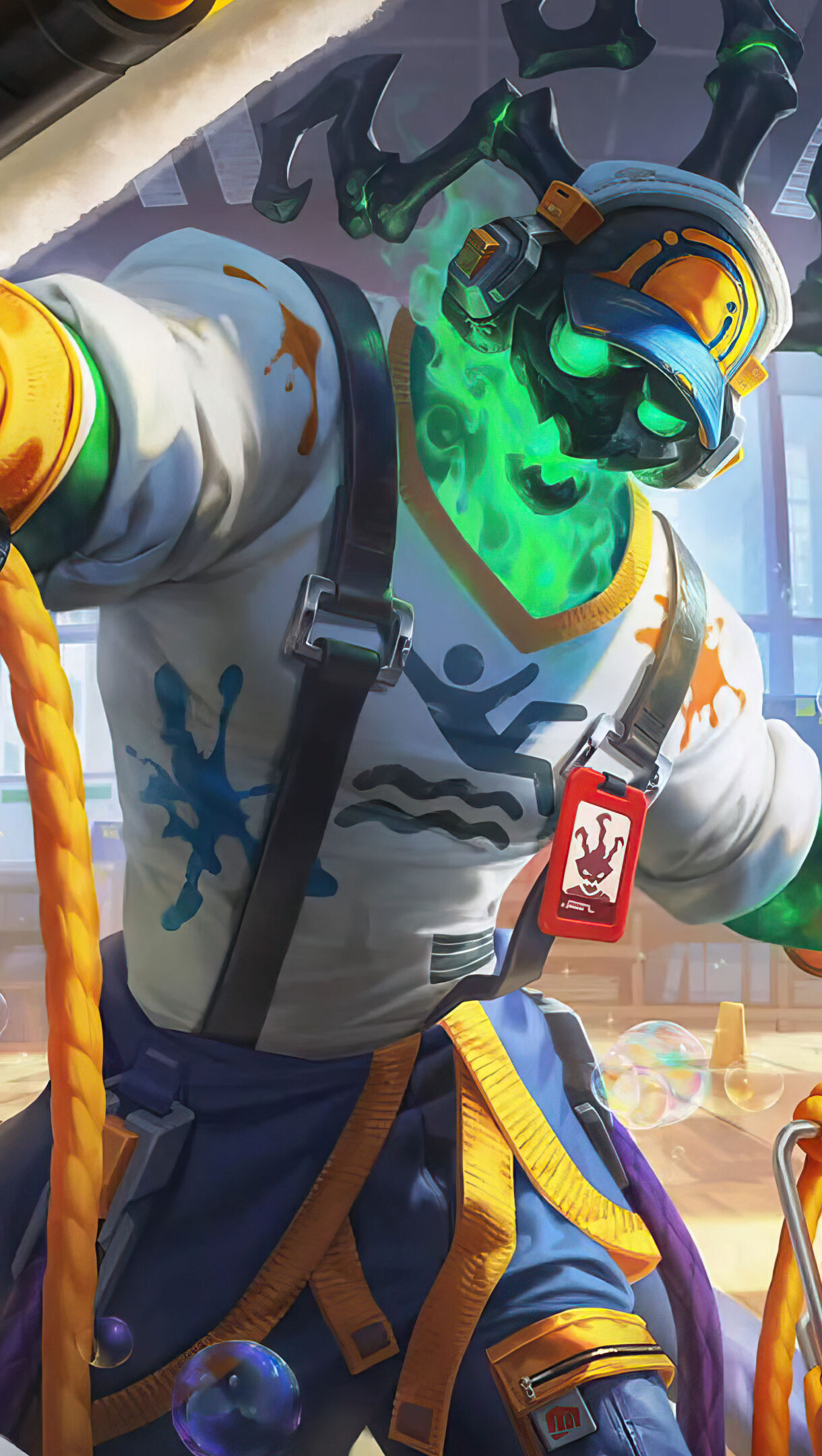A striking 4K wallpaper featuring the Janitor Thresh skin from League of Legends. Thresh, the Chain Warden, is depicted in his comical janitor attire, wielding a broom instead of his usual scythe, bringing a humorous twist to his menacing presence in the vibrant world of League of Legends.