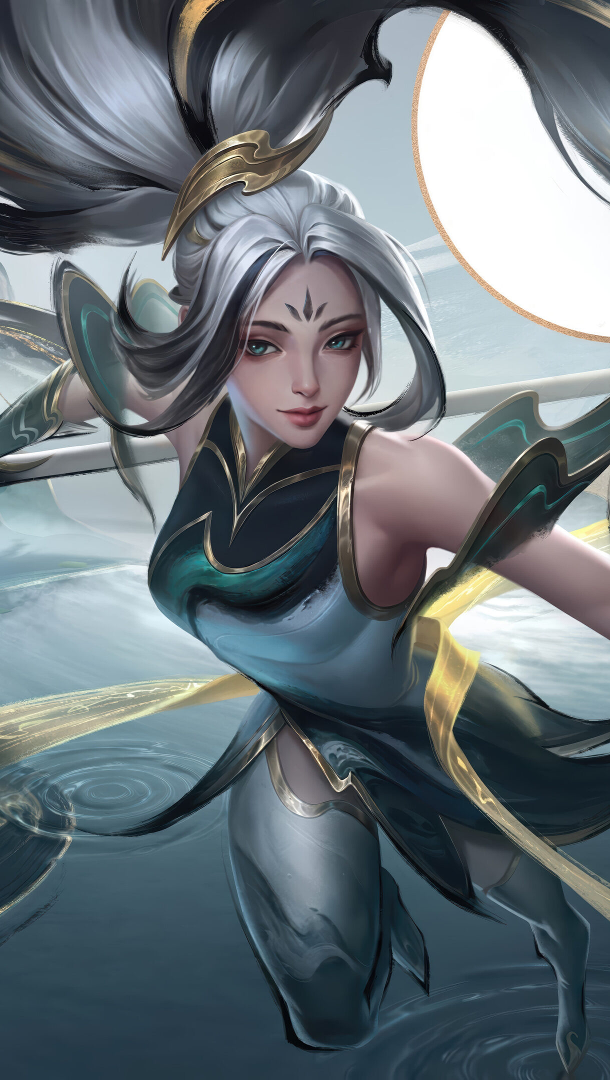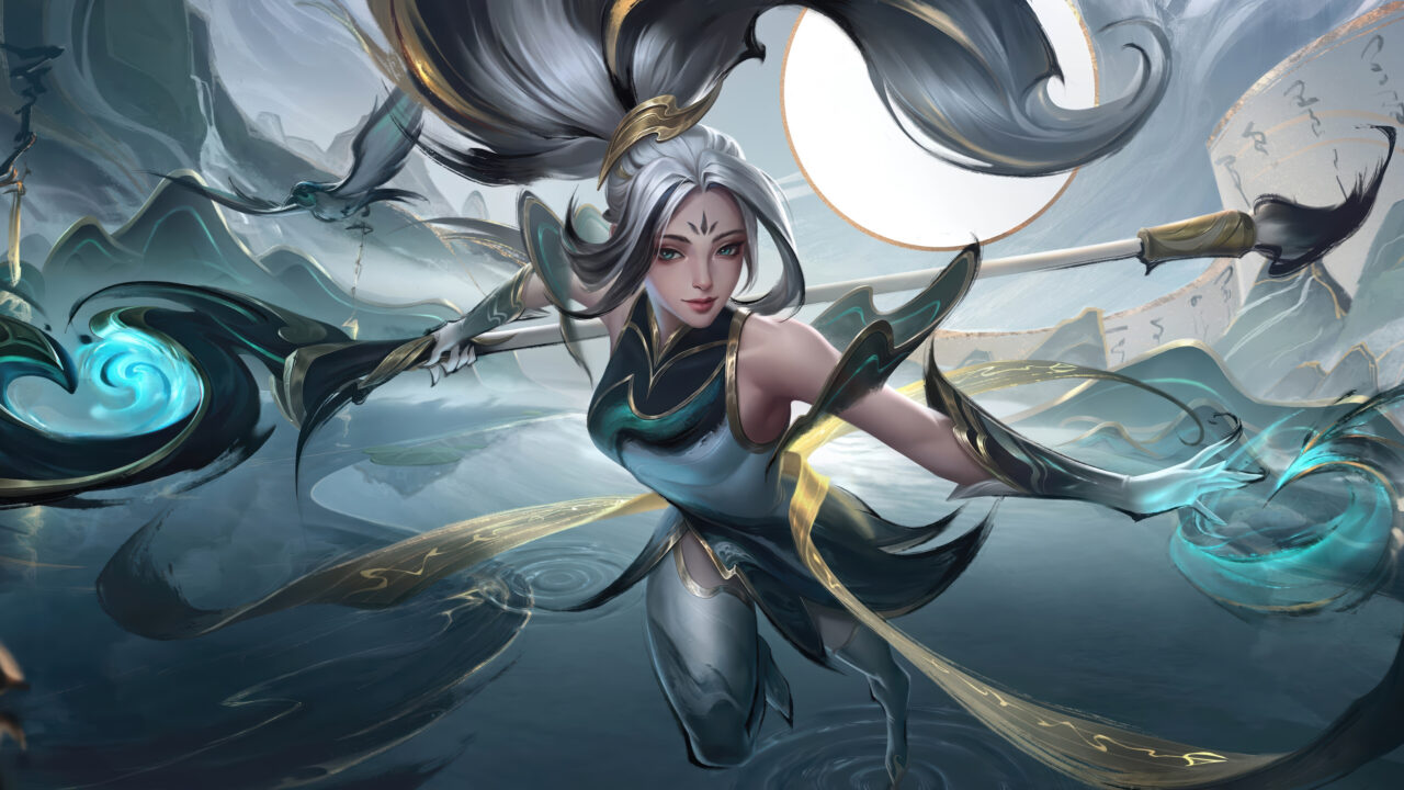 A captivating 4K wallpaper showcasing Janna in her Calligraphia Skin, a celestial figure hovering amidst stylized misty mountains and tranquil waters. The vibrant teal energy she wields, contrasted with her flowing white and dark hair and elegant gold accents, evokes a powerful and serene artistic spirit.