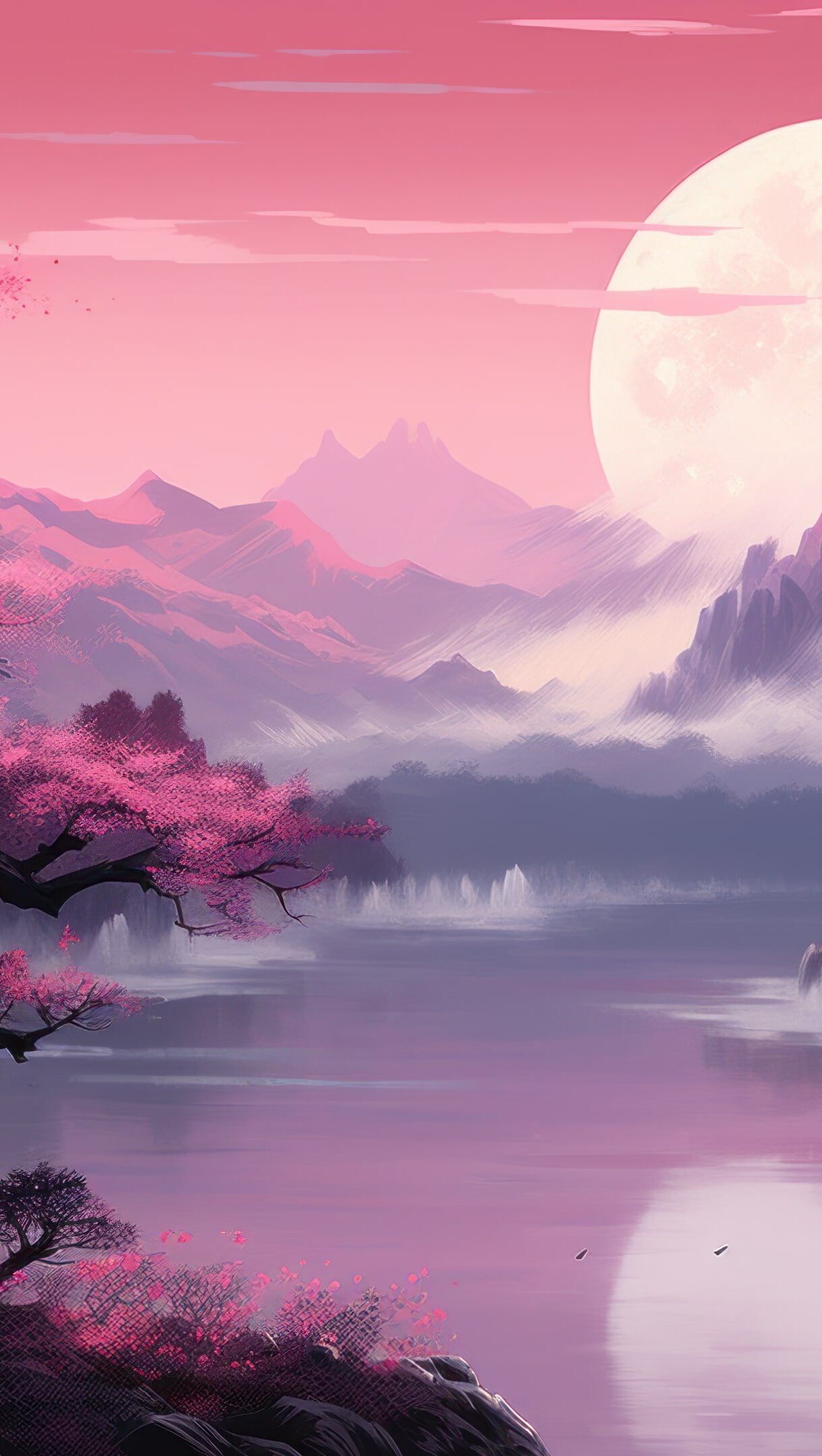 A breathtaking 4K wallpaper created by AI, featuring a picturesque Japanese cherry blossom landscape with delicate pink blossoms adorning serene sakura trees, capturing the beauty of spring and providing a tranquil background for your desktop.