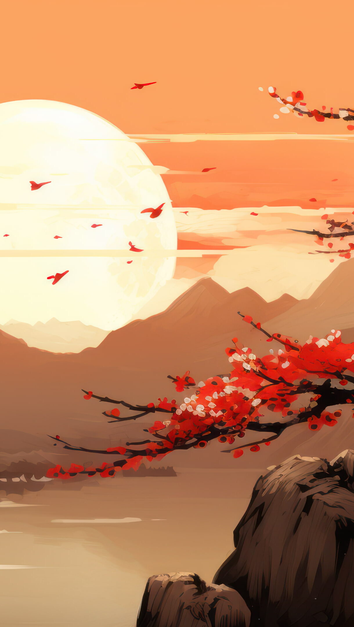 A mesmerizing 4K wallpaper created by AI, inspired by Japanese painting, showcasing a serene lake scenery surrounded by breathtaking natural landscapes. Simply click the download button to bring this masterpiece to life on your screen as a desktop wallpaper or save it for later in your picture collection.