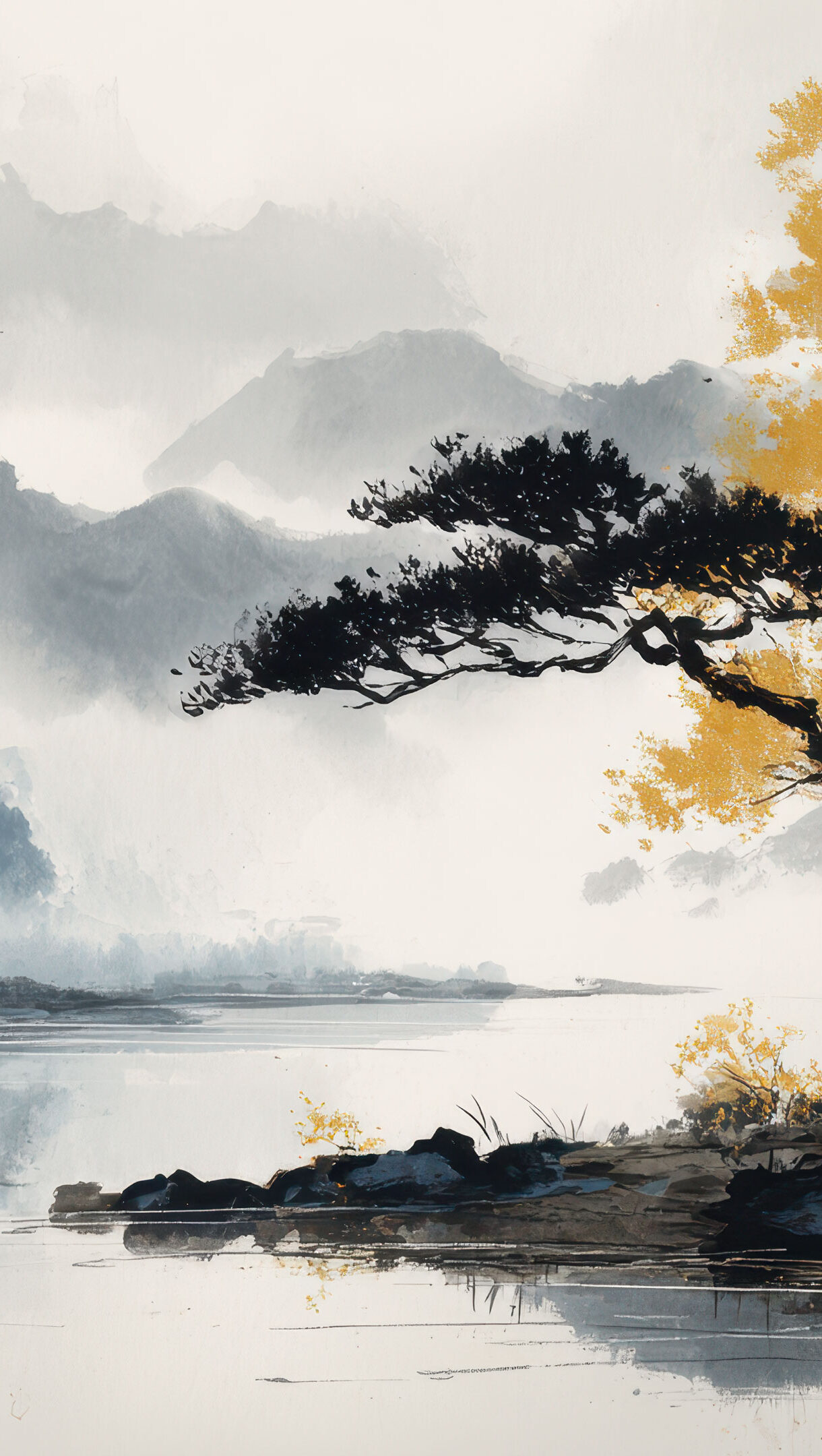 A tranquil 4K wallpaper portraying a Japanese Sumi-e landscape featuring a majestic golden-leaved tree on a rocky bank beside calm, reflective waters, with misty mountains in the background. The tree's vibrant golden foliage strikingly contrasts with the monochromatic blue and grey ink washes of the distant peaks and serene water, creating a profound sense of peaceful beauty.