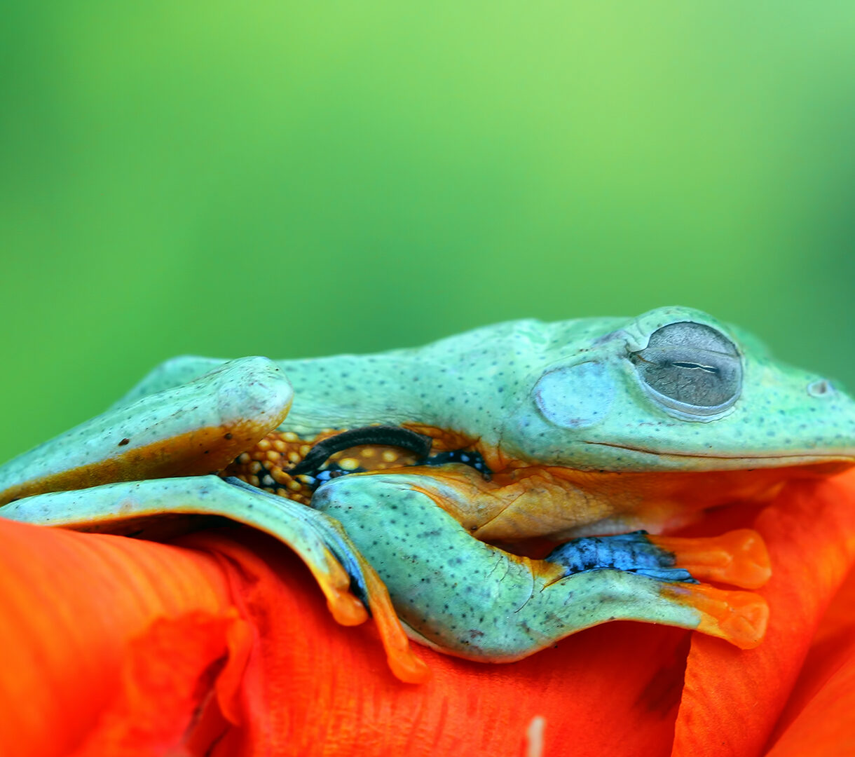 A captivating 4K wallpaper of a Javan Tree Frog resting peacefully on a vibrant orange flower petal. Its distinctive mint green and blue skin, accented with orange and black markings, creates a dramatic contrast against the intense orange bloom, set against a soft, unfocused green background, evoking a sense of tranquil tropical beauty.