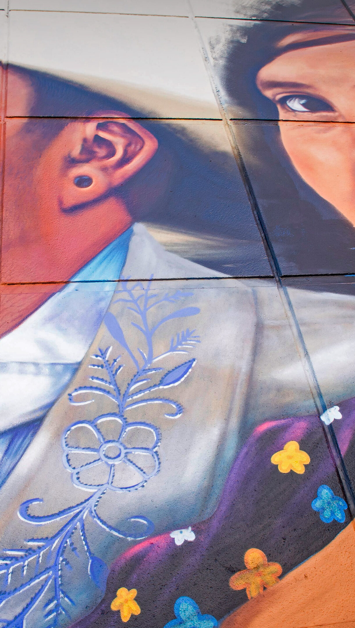 A powerful 4K wallpaper featuring artist Jesus 'Cimi' Alvarado intently painting his monumental 'Fronterizos' mural on a large wall, which depicts the expressive faces of a man and a woman. His active spray painting brings vibrant life and intricate detail to the vast artwork, emphasizing the dynamic interplay of color and texture against the wall's surface.