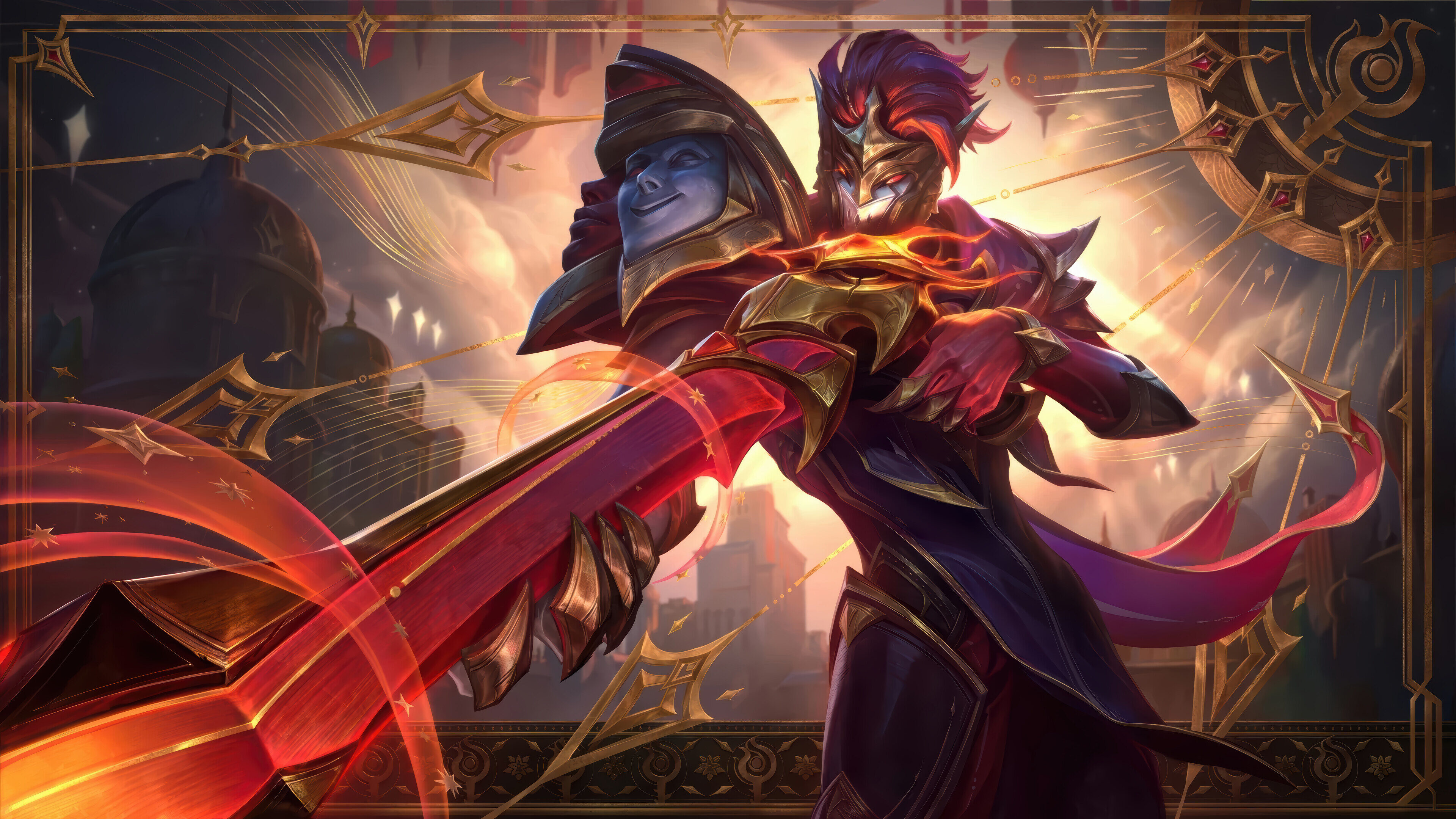 An enigmatic 4K wallpaper showcasing Jhin in his Arcana Skin, a theatrical figure clad in dark purple and gold armor with a blue and red mask on his shoulder, framed by ornate golden borders against a warm, celestial city skyline. His massive, glowing red and gold cannon emanates ethereal energy and star-like particles, creating a powerful and mystical aura that dominates the vibrant, warm background.