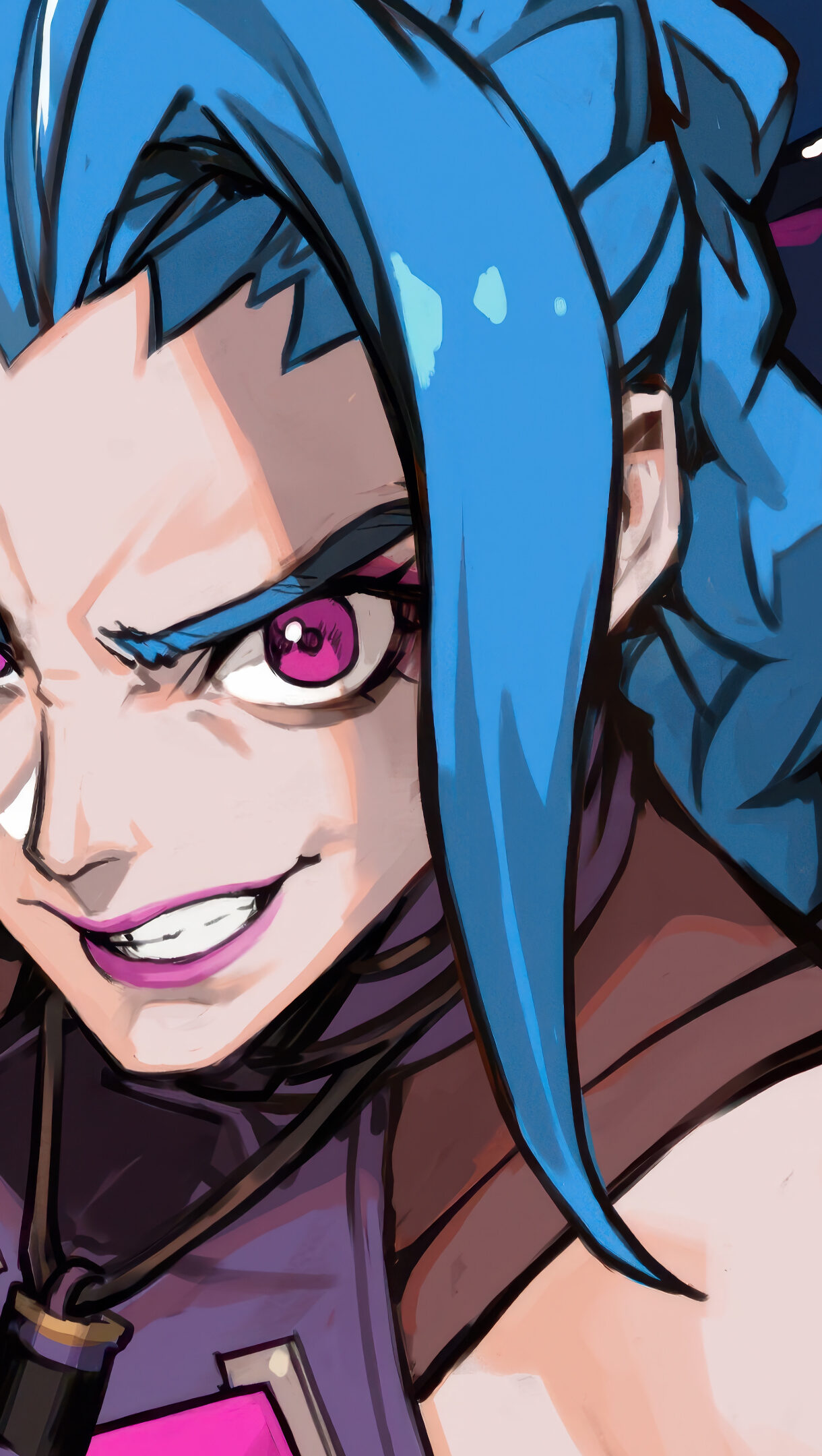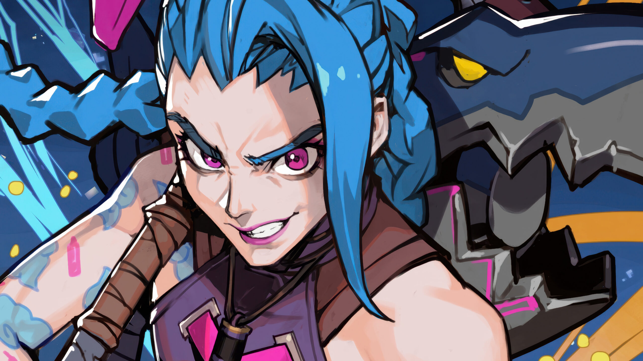 A vibrant 4K wallpaper showcasing Jinx from League of Legends, her intense pink eyes and mischievous grin dominating the foreground against a backdrop of abstract blue and orange shapes and a glimpse of her shark weapon. The sharp lines and electric colors perfectly capture her chaotic energy and the dynamic mood of the scene.