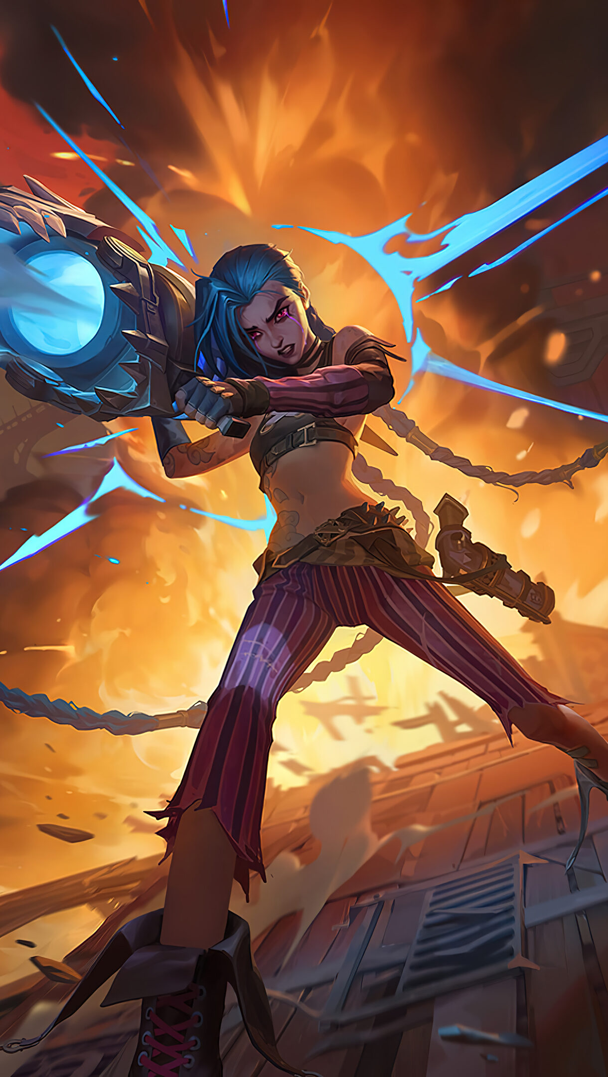 League of Legends 4K wallpaper featuring Jinx Rocket Launcher skin from Legends of Runeterra. Unleash Your Inner Creativity with High-Quality Wallpapers. AI-generated and sourced wallpapers available in High Quality Resolution. Simply click the download button to bring these masterpieces to life on your screen as a desktop wallpaper or save it for later in your picture collection.