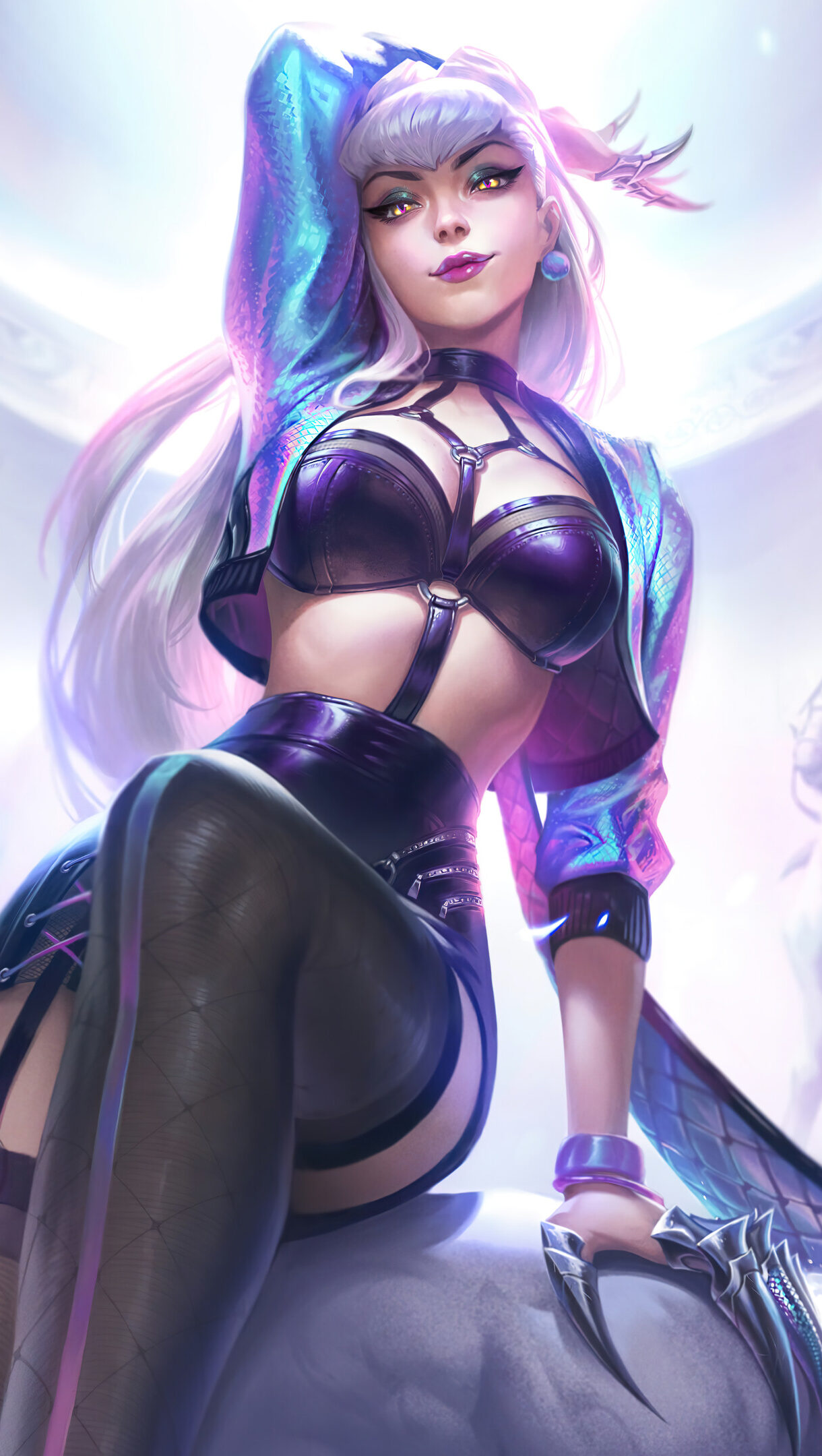 A captivating 4K wallpaper featuring the K/DA All Out Evelynn skin from League of Legends. Evelynn, the seductive Agony's Embrace, showcases her vibrant and stylish appearance in this splash art. Experience the excitement and thrill of League Of Legends on your screen. Simply click the download button to bring this masterpiece to life on your screen as a desktop wallpaper or save it for later in your picture collection.
