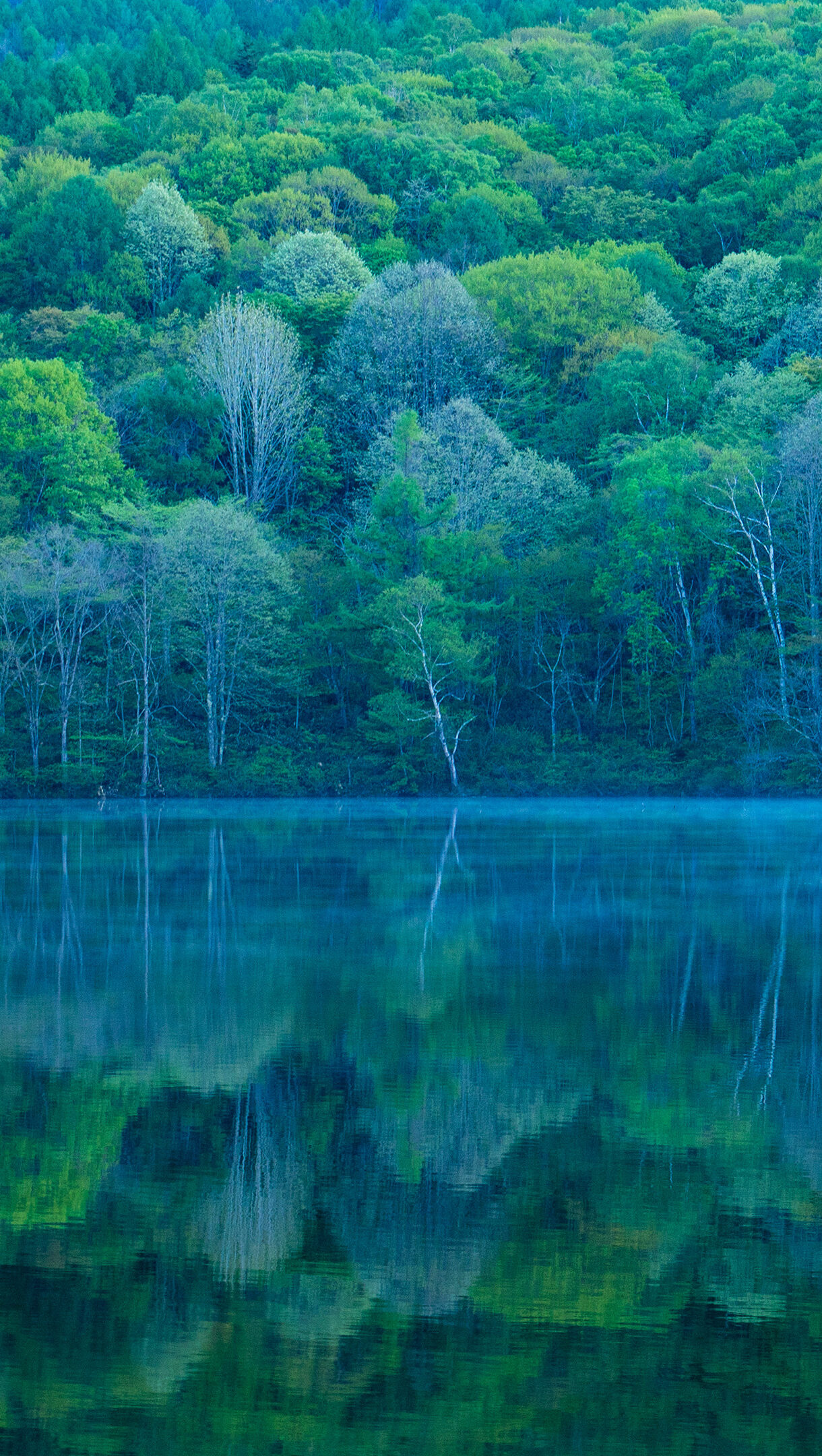 A captivating 4K wallpaper depicting Kagami-ike Mirror Pond in Nagano, Japan, features a dense forest lining its tranquil waters. The calm surface perfectly reflects the vibrant green and blue-toned trees, creating a stunning, almost symmetrical landscape with a subtle mist hovering above.