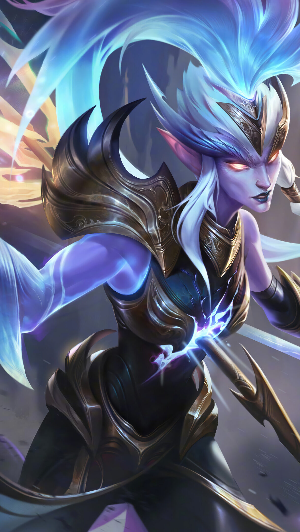 A radiant 4K wallpaper showcases Kalista, a formidable armored warrior with glowing red eyes and blue hair, poised to strike in a desolate, ethereal landscape swirling with dark energy. Her translucent, glowing blue and purple spectral limbs and weapon emanate dazzling light, sharply contrasting with the somber ruins and dynamic magical particles that define the scene's intense mood.