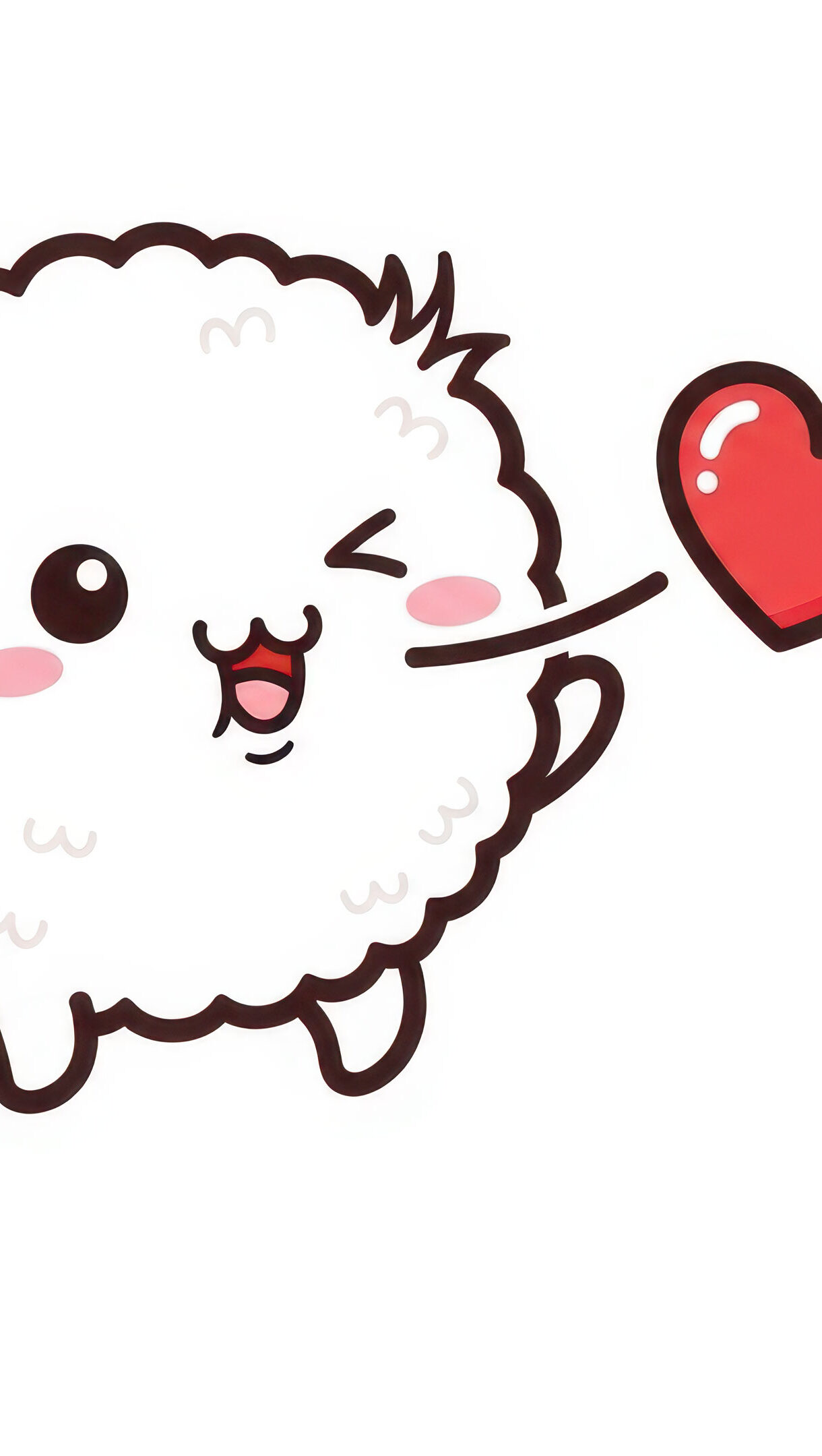 A vibrant 4K wallpaper showcasing an adorable, round, fluffy white character winking happily on a clean white background. Its bright rosy cheeks and the vivid red heart it blows capture a playful and affectionate kawaii aesthetic.