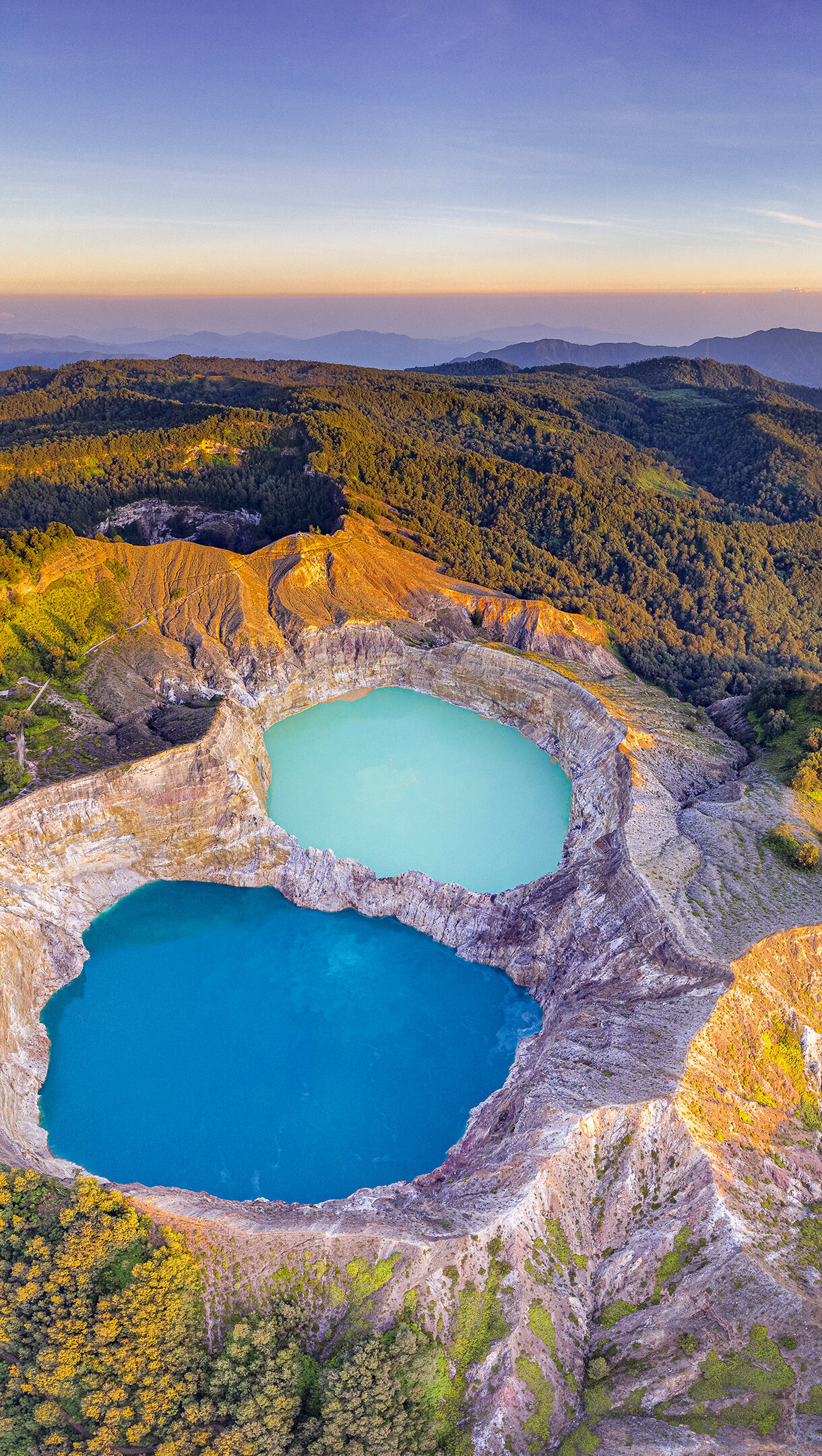A captivating 4K wallpaper showcases the unique Kelimutu Volcanic Crater Lakes at sunrise, nestled within lush, rugged mountains. The two distinct lakes glow with vibrant blue and light turquoise hues, dramatically illuminated by the rising sun's golden light that bathes the rugged crater walls and surrounding forested peaks.
