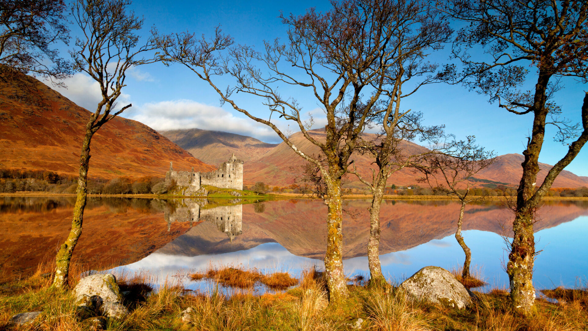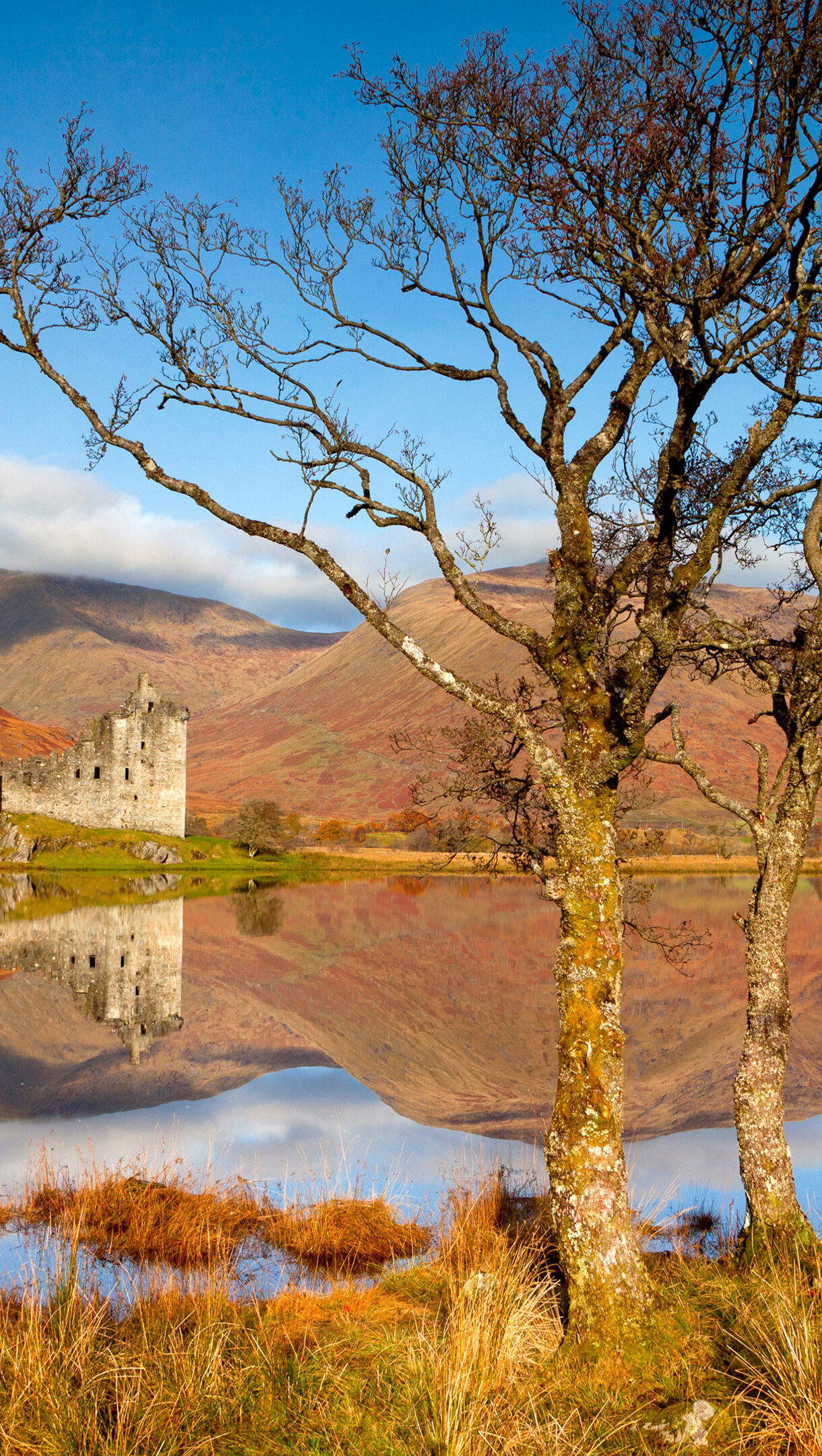 A breathtaking 4K wallpaper showcasing Kilchurn Castle standing majestically on a small peninsula in Loch Awe, surrounded by vibrant, rust-colored mountains under a clear blue sky. Its historic stone walls and the surrounding autumnal landscape are perfectly mirrored in the still, deep blue waters, creating a serene and symmetrical vista framed by the gnarled branches of foreground trees.